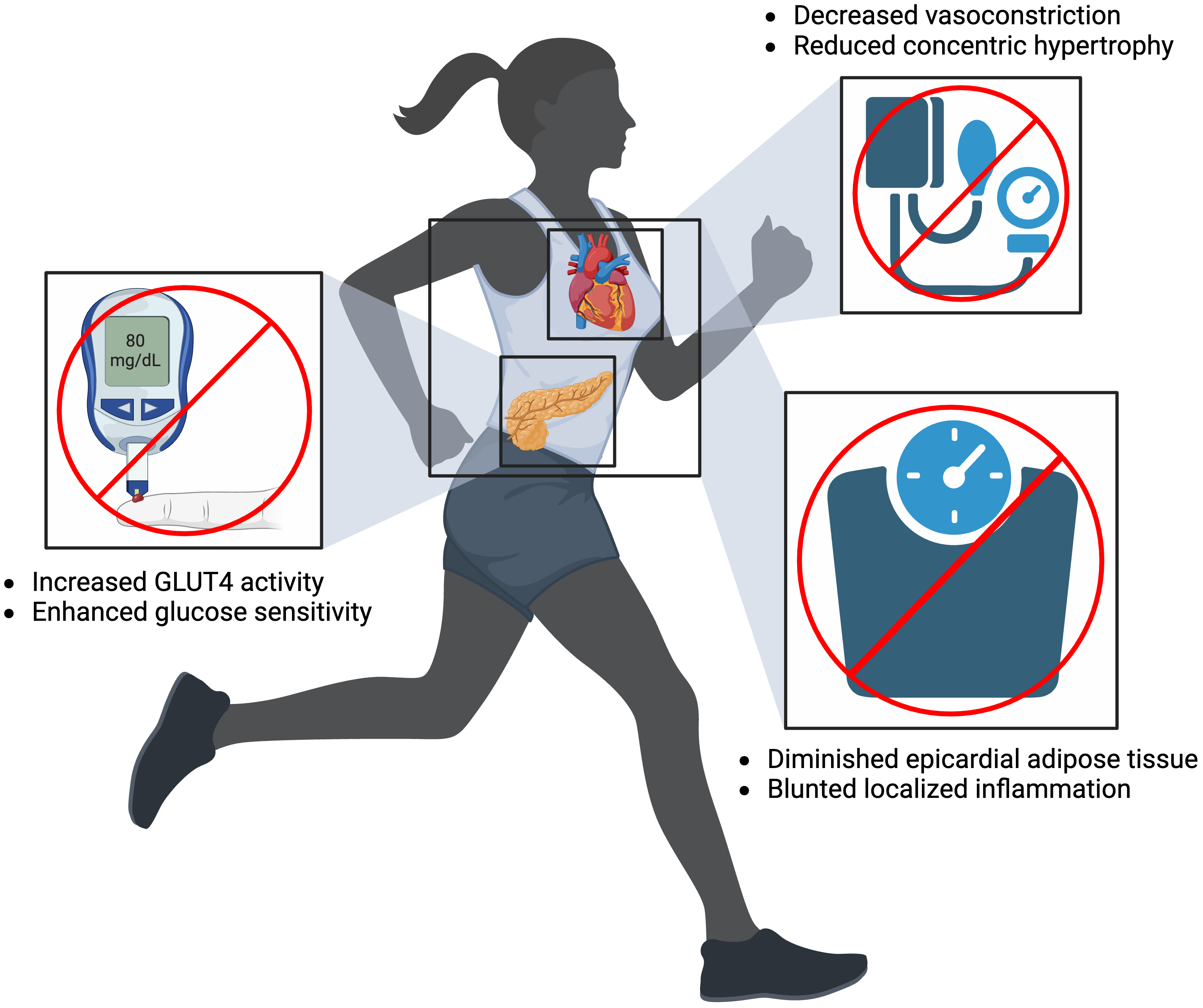 Fig. 3.Mitigating atrial fibrillation risk factors of diabetes mellitus (left), hypertension (top right), and obesity (bottom right) by increasing physical activity. Created on https://www.biorender.com/. GLUT4, glucose transporter type 4.