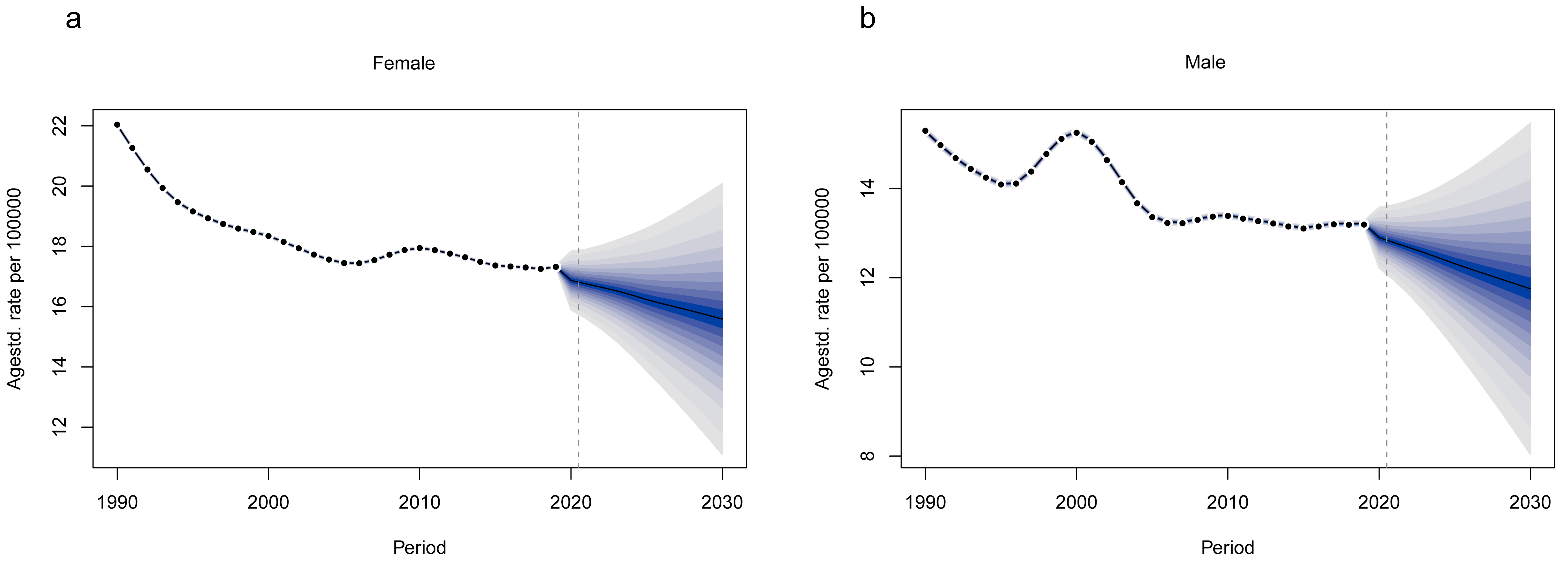 Fig. 2.BAPC model predicts age-standardized incidence of DMVD patients from 1990–2030. (a) Female. (b) Male. BAPC, Bayesian Age-Period-Cohort.