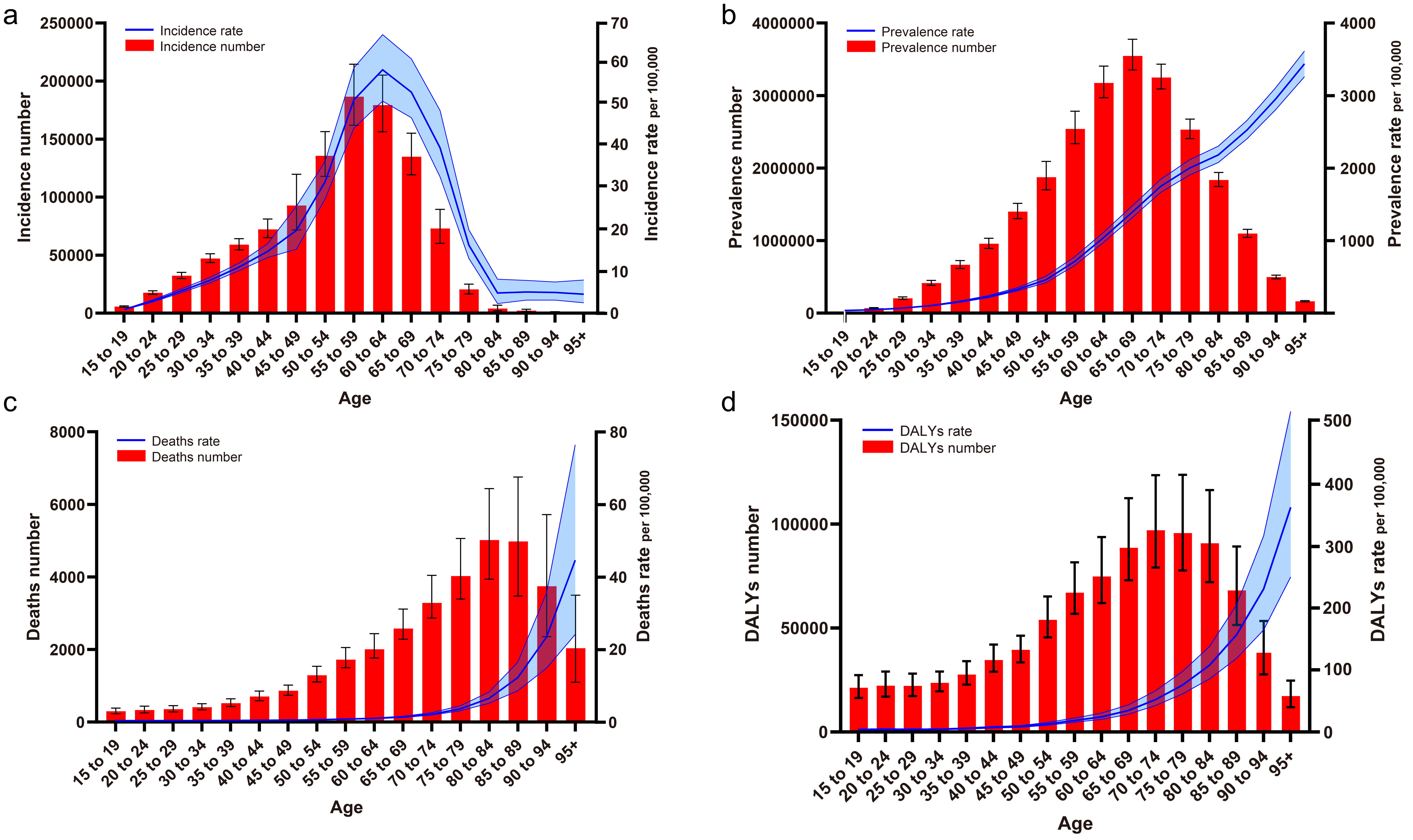 The global DMVD prevalence, deaths, and DALYs increase with age (Supplementary Table 2). In contrast, the incidence increases rapidly with age until age 65 years and peaks at age 60–64 years, declines rapidly after age 65 years, and plateaus after age 85 years. Fig. 3 illustrates these trends, the incidences gradually increases with age until age 60, peaks between 55–59 years, and then decline (Fig. 3a); the prevalence gradually increases with age until age 70, peaks between 65–69 years, and then decreases (Fig. 3b); the deaths gradually increases by age until the age of 85, peaks between 80–84 years, and then declines (Fig. 3c); and the DALYS gradually increases with age until age 75, peaks between 70–74 years, and then declines (Fig. 3d).