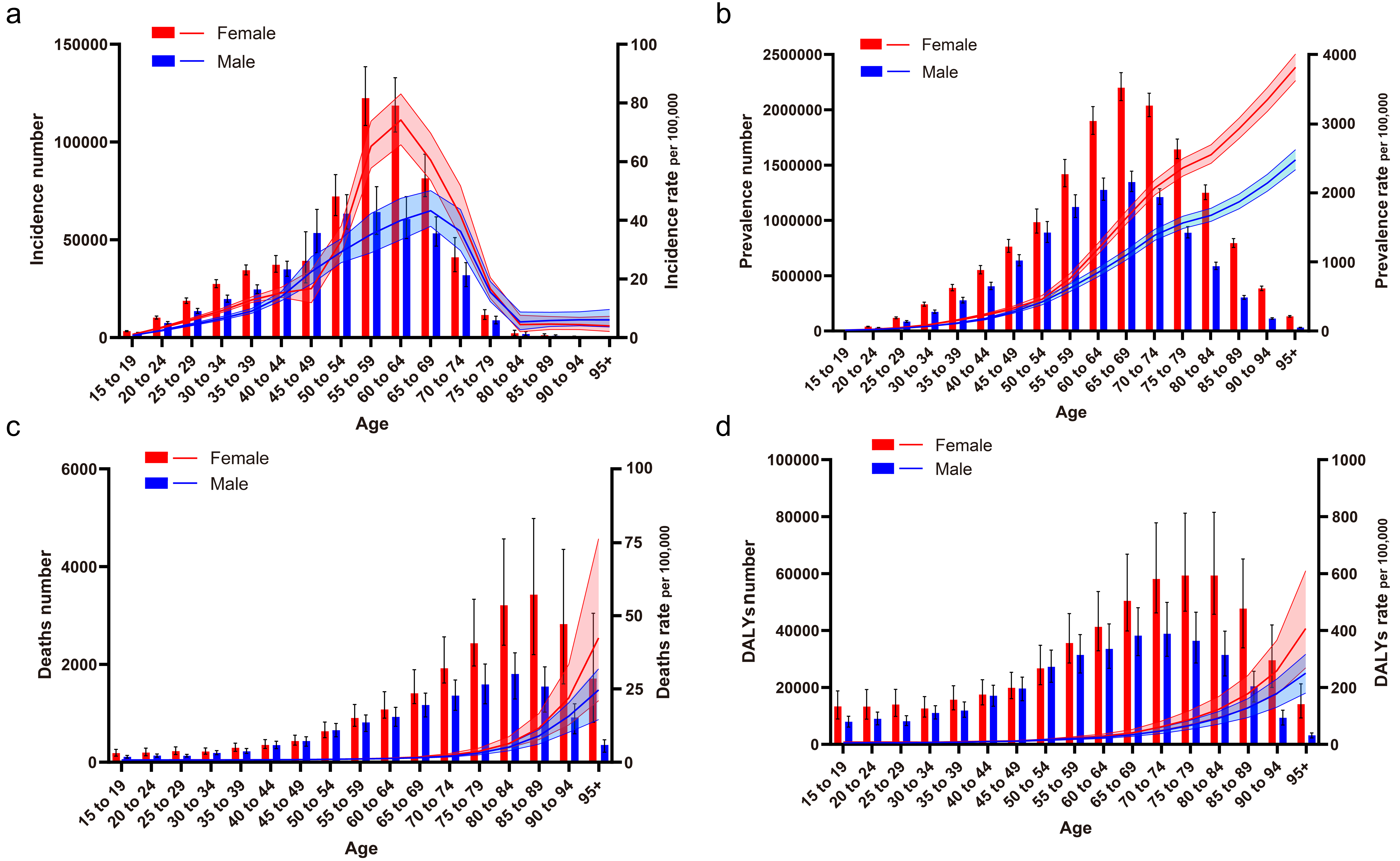 The incidence, prevalence, deaths and DALYs, and their rates are slowly increasing for both males and females from 1990–2019, with an overall higher disease burden for females than for males when looking at overall numbers and trends (Supplementary Fig. 1). And from 2019, there were significant differences in the burden of disease between males and females at all ages, with females having a more substantial number of incidences than males overall (except for the 45–49 age group), especially after 50 years of age; in prevalence, all ages were greater than males, and in deaths, females had a higher number of deaths in all age groups than males (except for the 50–54 age group), in DALYs, females were consistently higher than males (except for the 50–54 age group) (Fig. 4). Supplementary Tables 3,4 shows that the DMVD incidence rate in 2019 was 16.13/100,000 (15.31–17.02) for females and 11.38/100,000 (10.78–12.05) for males, the prevalence rate was 385.09/100,000 (367.06–403.14) for females and 241.64/100,000 (229.13–255.00), the deaths rate was 0.56/100,000 (0.44–0.76) for females and 0.33/100,000 (0.26–0.39) for males, and the DALYs rate was 13.70/100,000 (11.37–17.81) for females and 9.14/100,000 (7.52–10.99) for males. As seen in Supplementary Fig. 2, female incidence and prevalence are higher than male across SDI regions, and both indicators are positively correlated with SDI levels (Supplementary Fig. 2a,b). In addition, deaths and DALYs are also higher for females than for males, but these two indicators show a U-shaped distribution across SDI levels (Supplementary Fig. 2c,d).