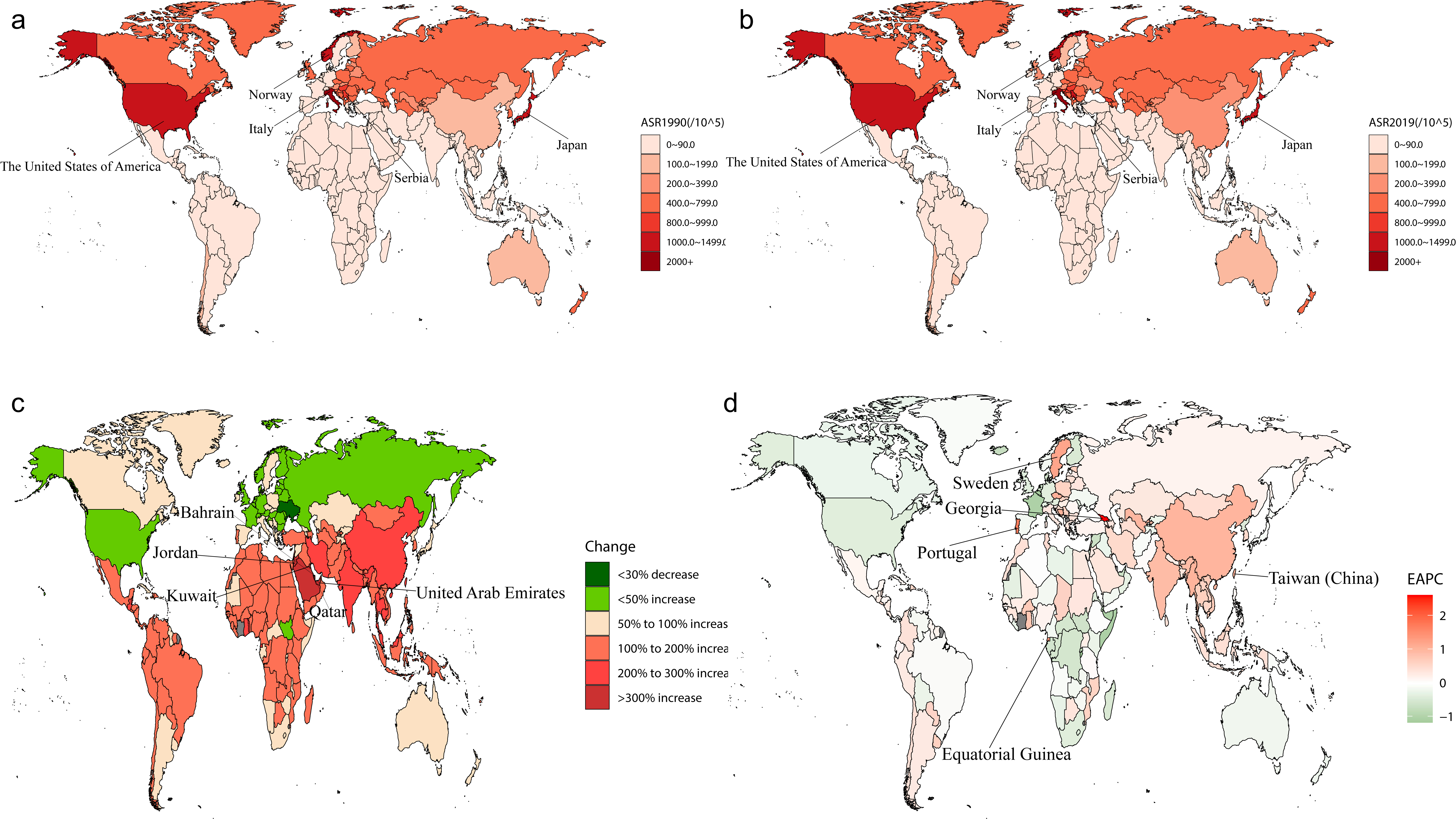 Fig. 5.Geographic heat map. (a) ASR of DMVD patient prevalence in 1990. (b) ASR of DMVD patient prevalence in 2019. (c) Change in prevalence 1990–2019. (d) EAPC of prevalence 1990–2019. ASR, age-standardized rate; EAPC, estimated annual percentage change; DMVD, degenerative mitral valve disease.
