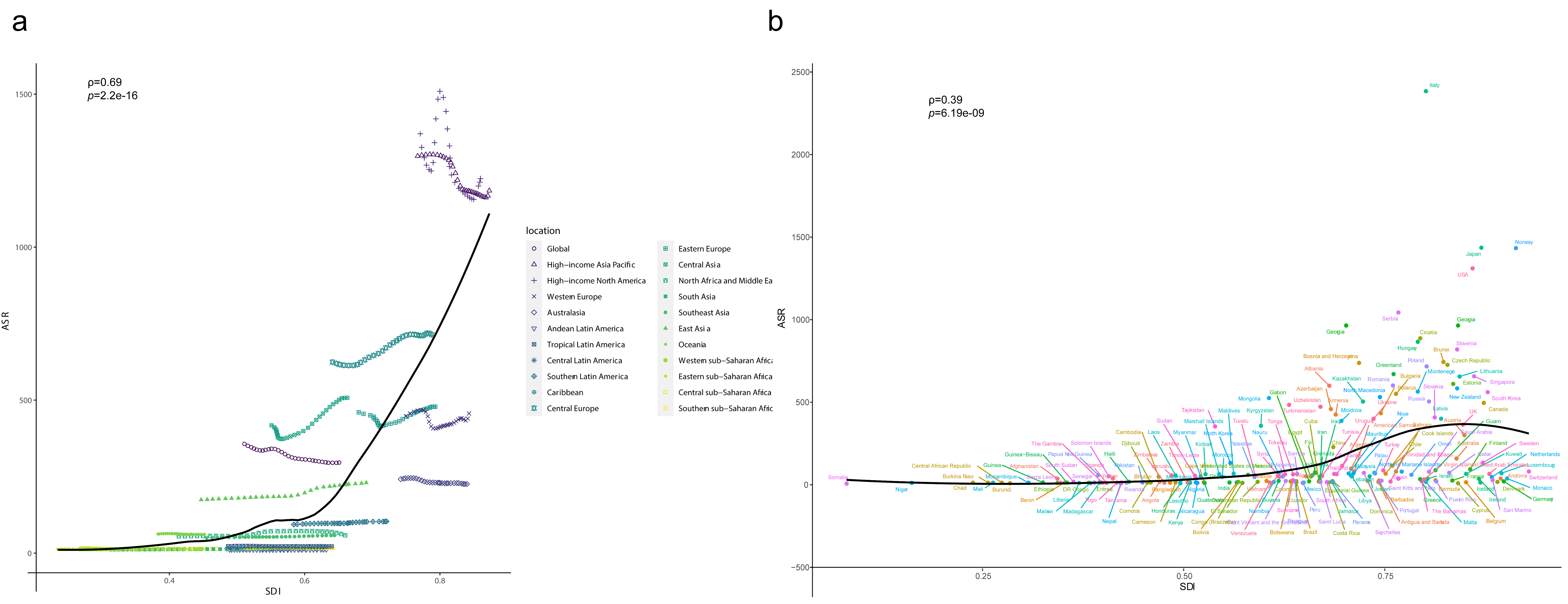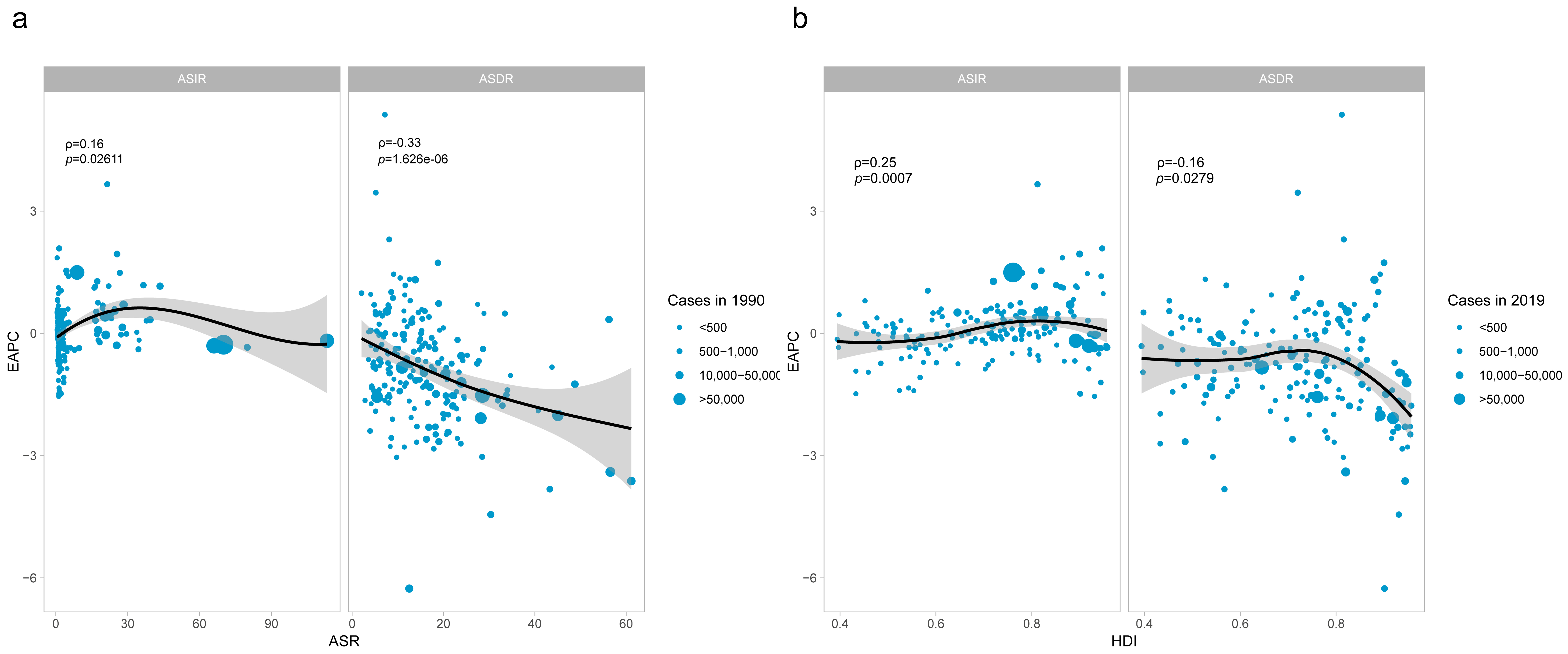 Fig. 7.The correlation between EAPC and DMVD ASR in 1990 (a) and HDI in 2019 (b).