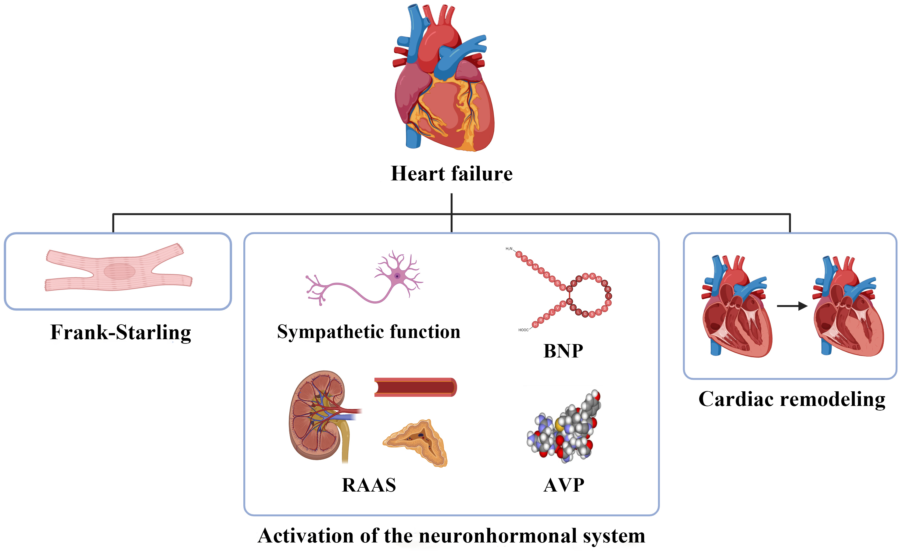 HF is characterized by structural or functional disorders affecting the filling and/or ejection of blood from the ventricles. Based on the left ventricular ejection fraction (EF), HF can be classified into three phenotypes: HF with preserved EF (HFpEF), mildly reduced EF (HFmrEF), and reduced EF (HFrEF) [3]. Currently, the primary mechanisms involved in HF include the Frank-Starling mechanism, activation of the neurohormonal system, and cardiac remodeling [4]. The activation in the neurohormonal system includes the sympathetic nervous system, the renin–angiotensin–aldosterone system and the secretion of humoral factors such as natriuretic peptides and arginine vasopressin [5, 6] (Fig. 1). However, the underlying molecular mechanisms warrant further investigation.
