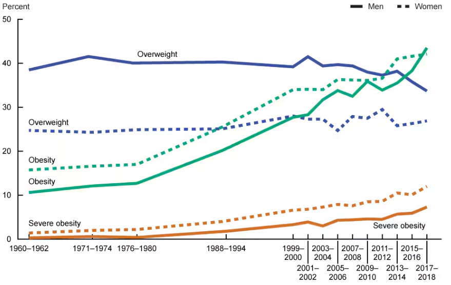 Trends in overweight or obesity prevalence in the United States of America (included with approval from Fryar et al. [14] National Center for Health Statistics Health E-Stats. 2020).