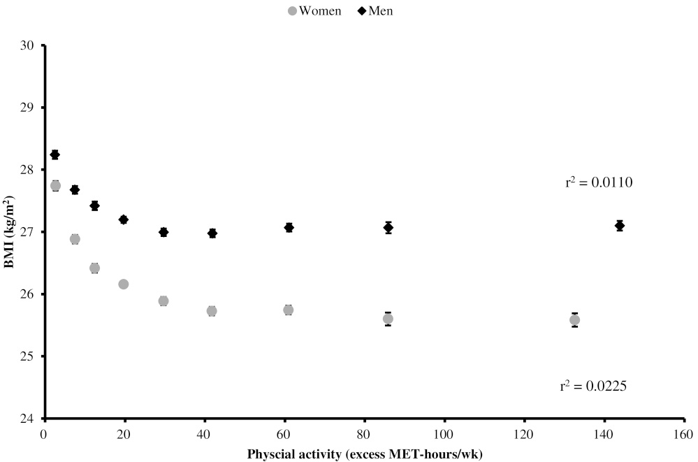 BMI by levels of PA engagement (included with approval from Bradbury et al. [68] BMJ Open. 2017). BMI, body mass index; PA, physical activity; MET, metabolic equivalent of task.