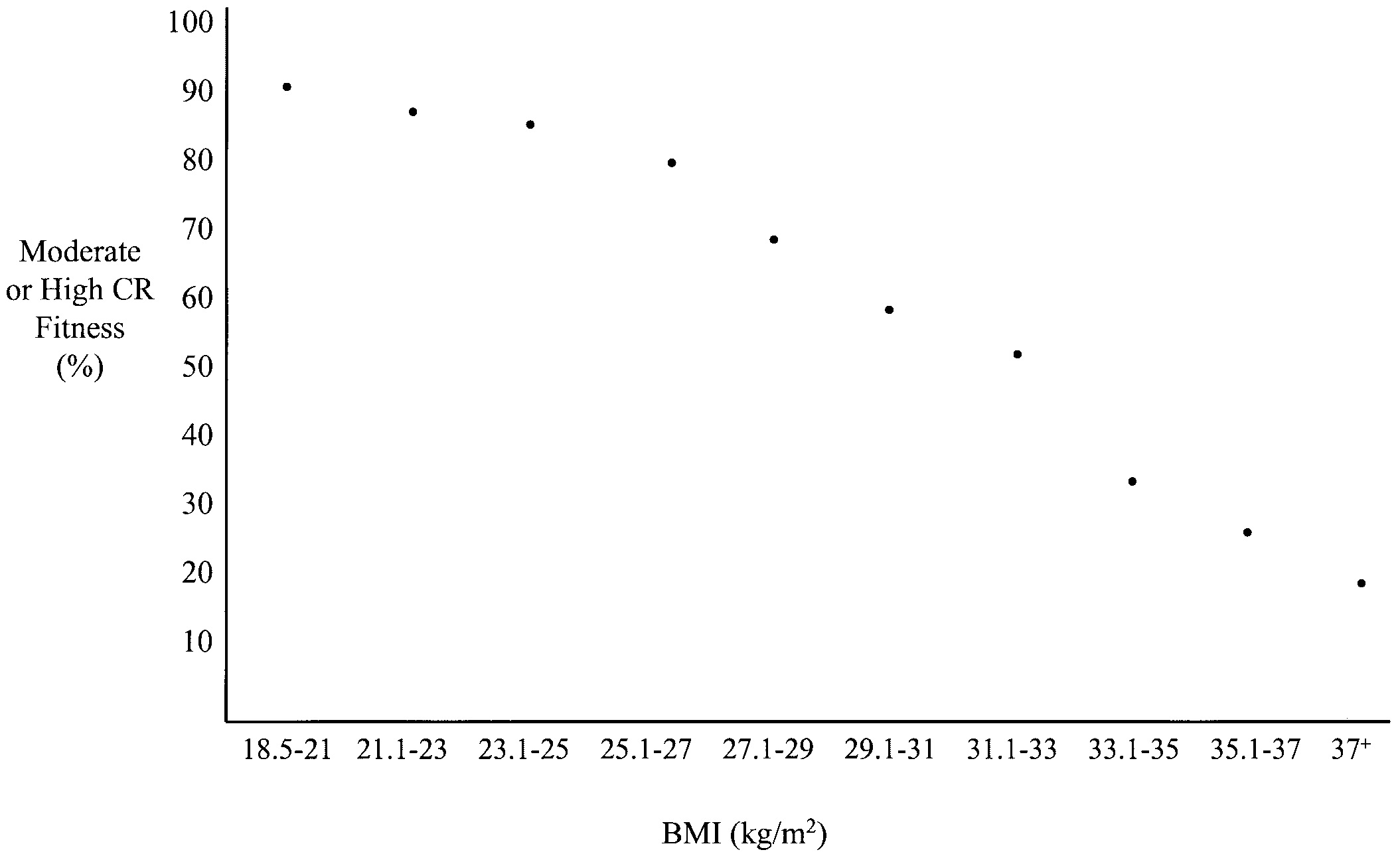 BMI by CRF level (included with approval from Farrell et al. [76] Obesity Research. 2002). BMI, body mass index; CRF, cardiorespiratory fitness; CR, cardiorespiratory.
