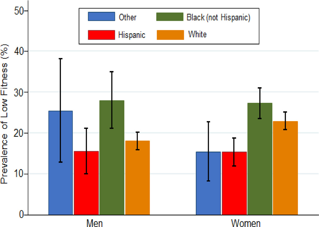 Prevalence of low CRF by race/ethnicity (included with approval from Kaze et al. [94] BMJ Open. 2022). CRF, cardiorespiratory fitness.
