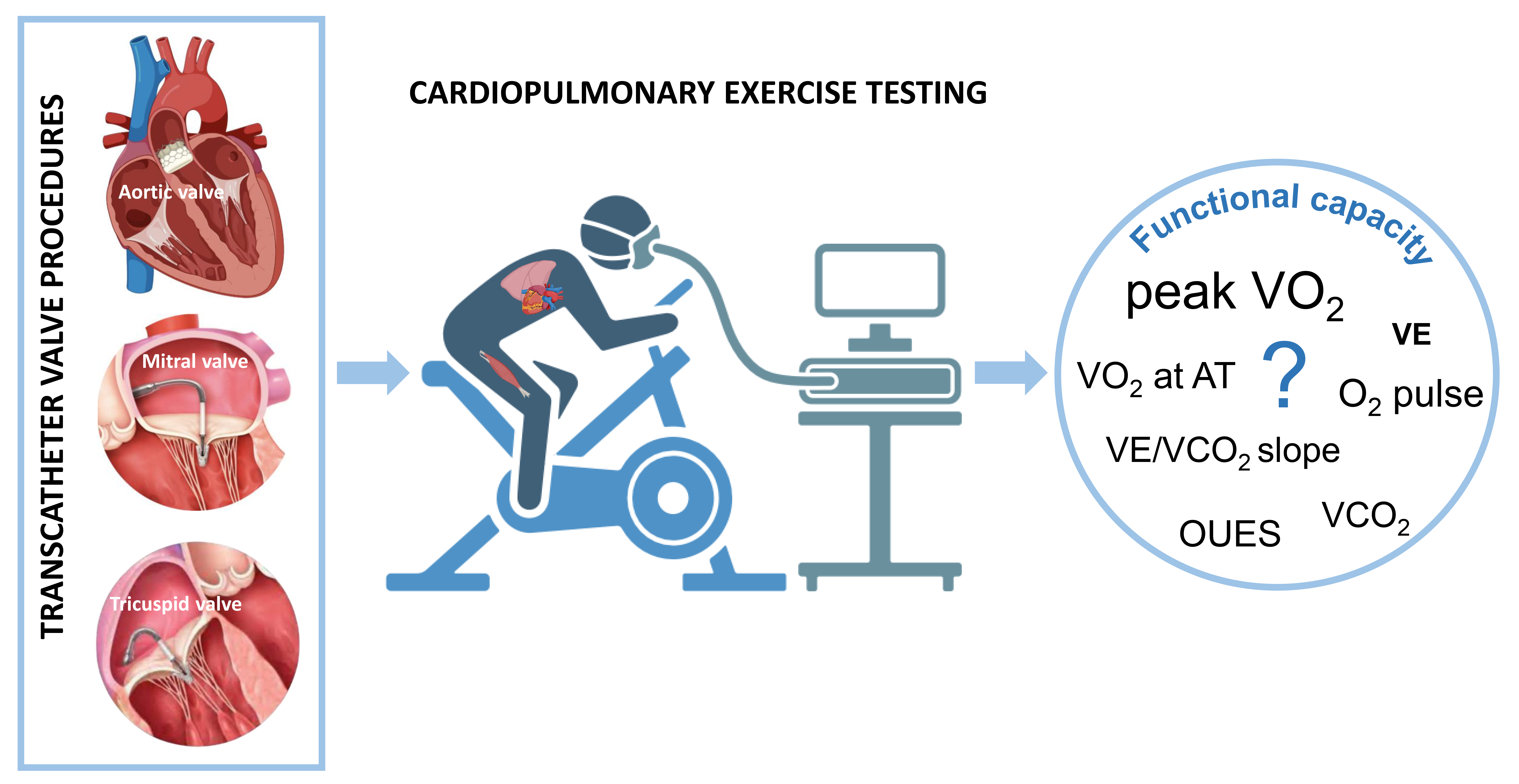 Cardiopulmonary exercise testing in transcatheter valve procedures. Transcatheter valve procedures have become a cornerstone in managing patients with valvular heart disease and high surgical risk. However, the objective quantification of functional improvement after procedures remains elusive due to a lack of robust data. Cardiopulmonary exercise testing, providing a comprehensive evaluation of the human body’s performance, may emerge as a promising tool in this setting. VE/VCO2 slope, minute ventilation/carbon dioxide production slope; VO2, oxygen consumption; VCO2, carbon dioxide production; AT, anaerobic threshold; VE, minute ventilation; OUES, oxygen uptake efficiency slope.