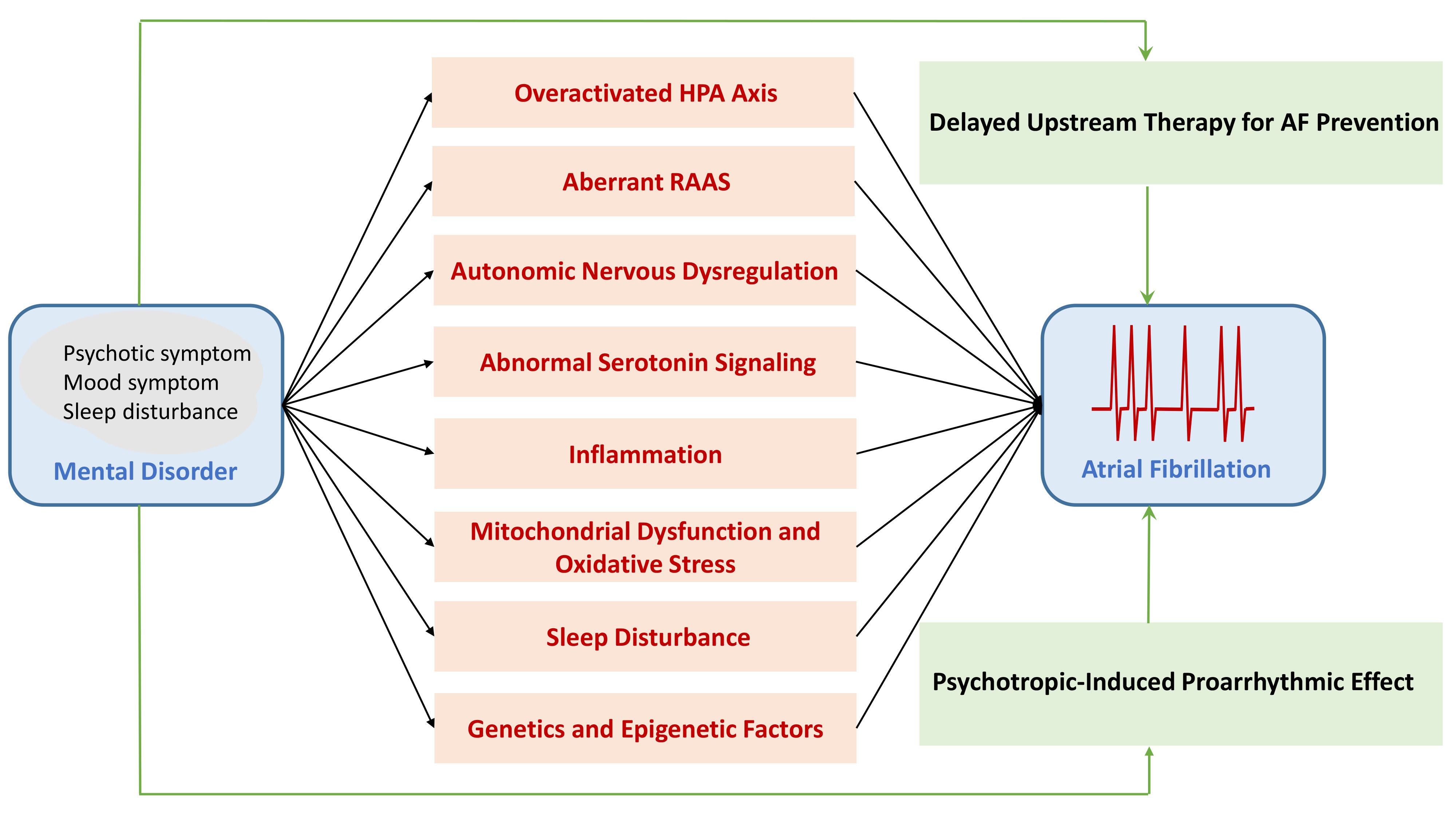 Putative mechanistic pathways leading to atrial fibrillation (AF) in patients with mental disorder (MD). Patients with MD are prone to developing AF through mechanisms involving overactivation of the hypothalamic–pituitary–adrenal (HPA) axis, aberrations in the renin–angiotensin–aldosterone system (RAAS), autonomic nervous dysregulation, abnormal serotonin signaling, inflammation, mitochondrial dysfunction, oxidative stress, sleep disturbance; and genetic and epigenetic factors.