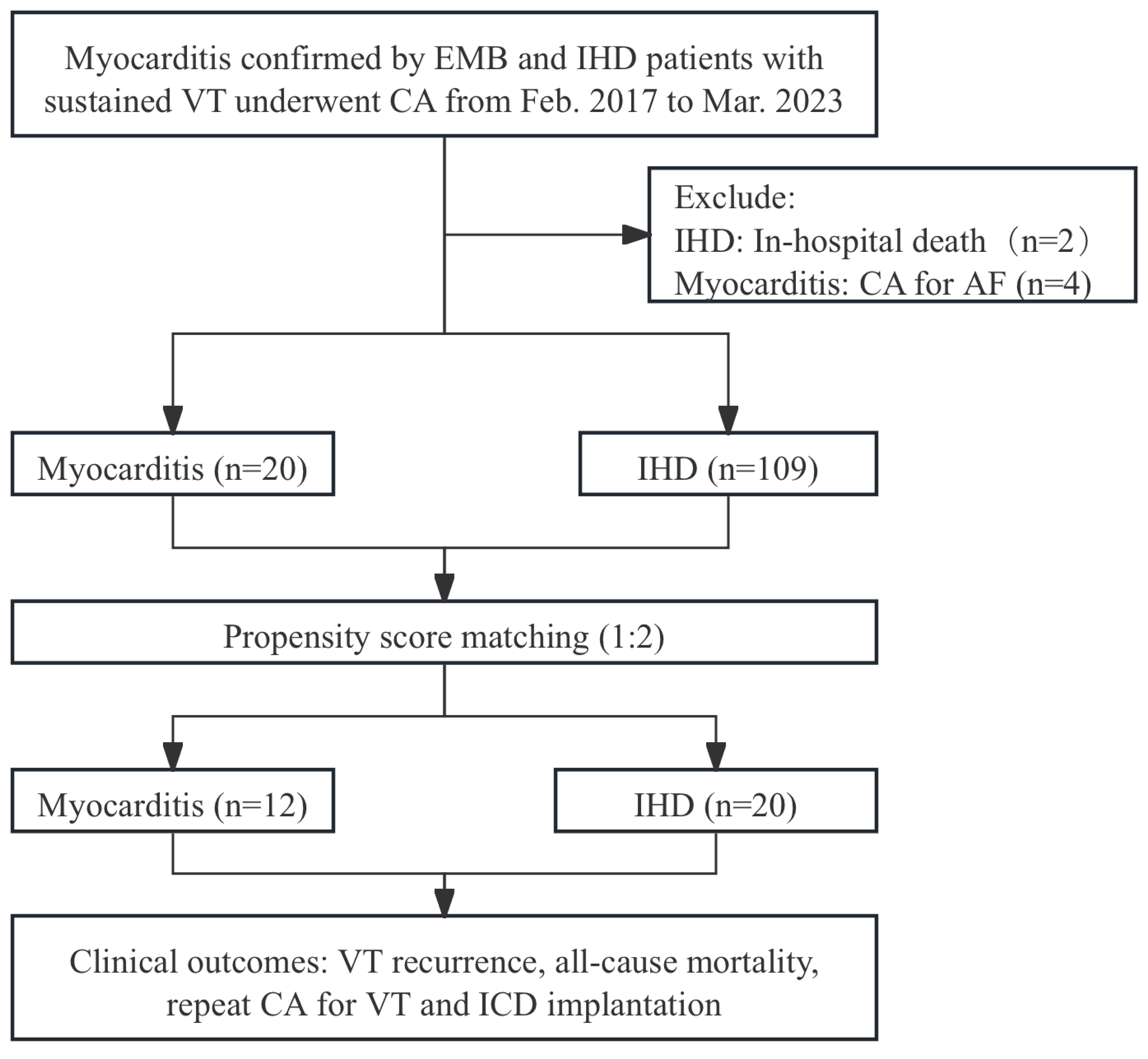 Patients undergoing CA for sustained VT confirmed by endomyocardial biopsy as myocarditis, and patients with IHD experiencing sustained VT undergoing CA were retrospectively enrolled from February 2017 to March 2023. Initially, an endocardial approach was employed, reserving epicardial ablation procedures for non-responders. The primary endpoint was VT recurrence during follow up. All-cause mortality, repeat CA for VT and implantable cardioverter-defibrillator (ICD) implantation served as secondary endpoints. Kaplan-Meier curves compared outcomes between patient groups.