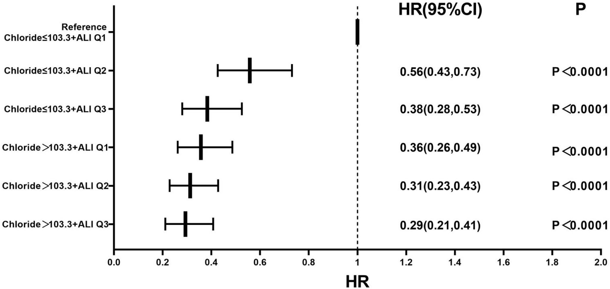rate in the serum chloride, ALI, and combined groups. The multivariate Cox