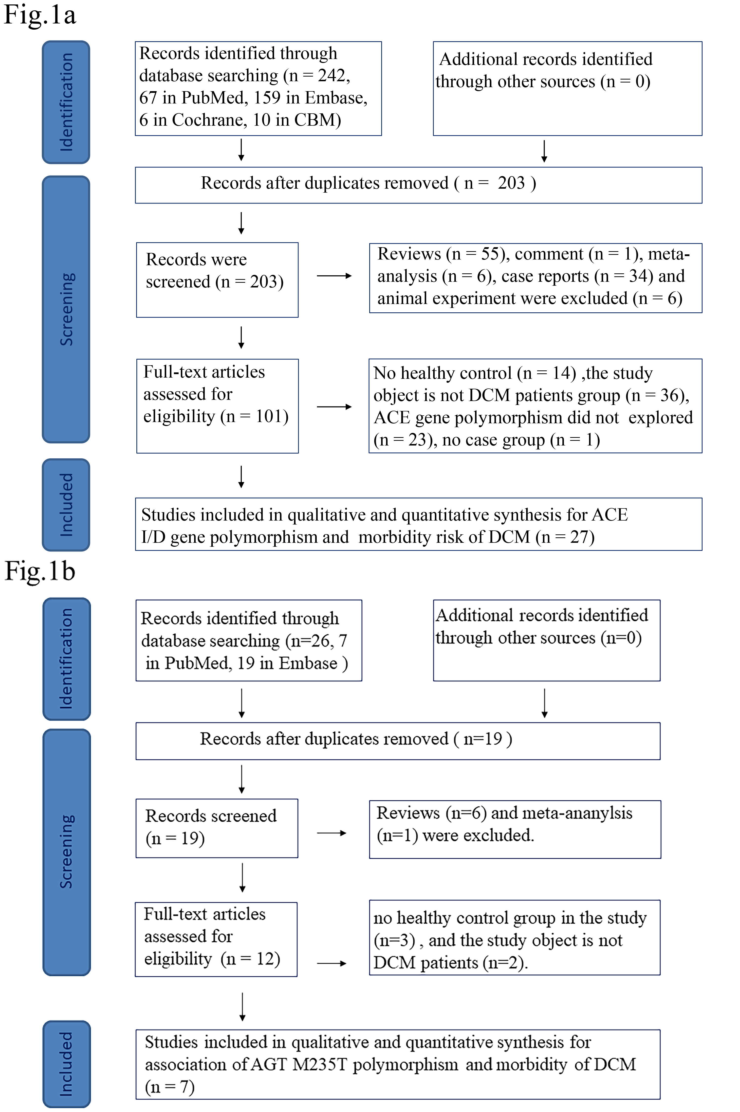 Flow diagram highlighting the criteria for selection of the studies. (a) ACE I/D flow diagram. (b) AGT flow diagram. DCM, dilated cardiomyopathy; ACE, angiotensin converting enzyme; AGT, angiotensinogen; I/D, insertion/deletion; CBM, the China Biology Medicine disc.