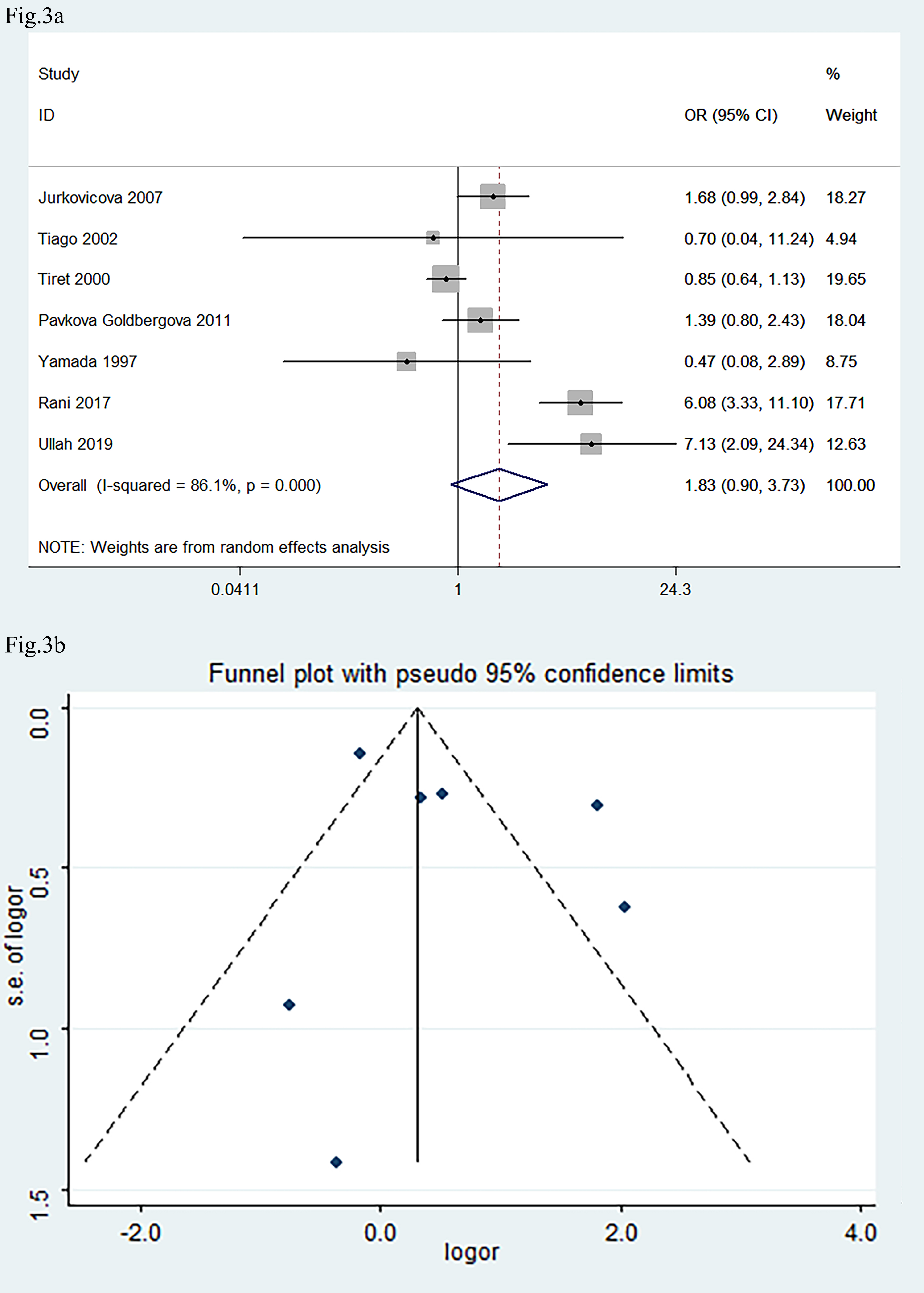 The pooled OR was 1.83 (Fig. 3a: 95% CI: 0.90, 3.73; p
