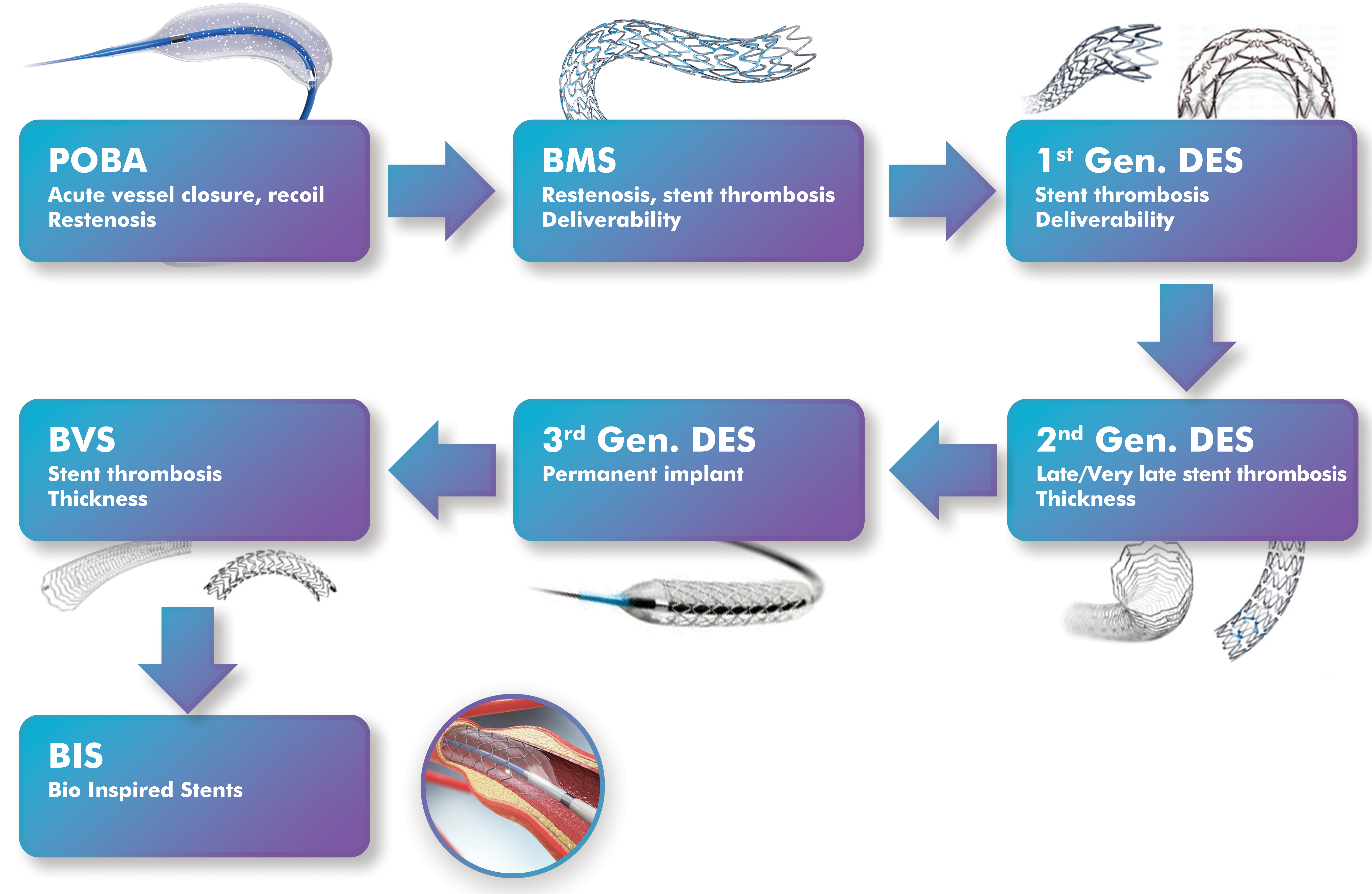 Plain old balloon angioplasty (POBA), introduced in the late 1970s, offered a nonsurgical method of revascularization, but was unable to overcome the problems of elastic recoil and restenosis. This led to the emergence of BMS in the 1990s, which provided structural support but failed to prevent neointimal hyperplasia (NIH). In the early 2000s, DESs with antiproliferative drug coatings were introduced. However, these also raised concerns about delayed healing and thrombosis. Second-generation DESs, introduced in the early 2010s, improved upon these with biocompatible polymers and more effective drugs, significantly reducing adverse events. The third generation DESs, developed just a few years later from the second-generation ones and characterized by biodegradable polymers and ultra-thin supports, further improved long-term safety and performance. In the years concurrent with third generation DESs, BVS emerged with the promise of temporary support and complete absorption, while in the following years they faced mechanical support and clinical limitations [10, 11].
