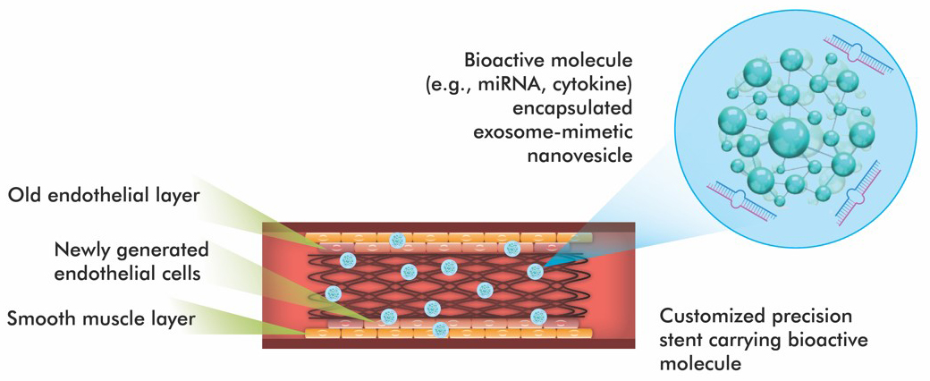 BMS have provided mechanical scaffolding, but high rates of in-stent restenosis (ISR) due to neointimal hyperplasia (NIH) have restricted their use. Despite the introduction of DES, which has significantly reduced restenosis, the problem of restenosis has not been fully resolved. Because of their mechanism of action, the drugs used to prevent stenosis also delayed endothelialization and increased the risk of late and very late stent thrombosis (ST) [4]. Bioresorbable vascular scaffolds (BVS) that dissolve over time and are excreted by the body have been developed recently. While BVS was designed to eliminate the long-term presence of a metallic implant, concerns about scaffold thrombosis, polymer degradation, and limited radial durability have significantly limited its widespread adoption [4, 5]. These limitations highlight a fundamental challenge in developing stents that can provide sustained suppression of NIH without impairing vascular healing. Exosome-mimetic nanovesicle (EMNV) coatings offer a potential solution to address this therapeutic challenge.
