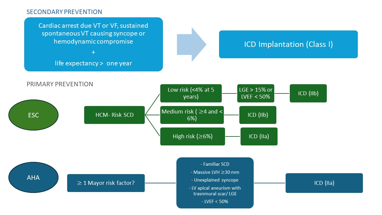 Flowchart of sudden cardiac death risk assessment and implantable cardioverter-defibrillator implantation indications according to European (2023) and American (2024) guidelines. AHA, American Heart Association guidelines; ESC, European Society of Cardiology guidelines; HCM, Hypertrophic Cardiomyopathy; ICD, Implantable Cardioverter-Defibrillator; LGE, Late Gadolinium Enhancement; LV, Left Ventricular; LVEF, Left Ventricular Ejection Fraction; LVH, Left Ventricular Hypertrophy; SCD, Sudden Cardiac Death; VF, Ventricular Fibrillation; VT, Ventricular Tachycardia.