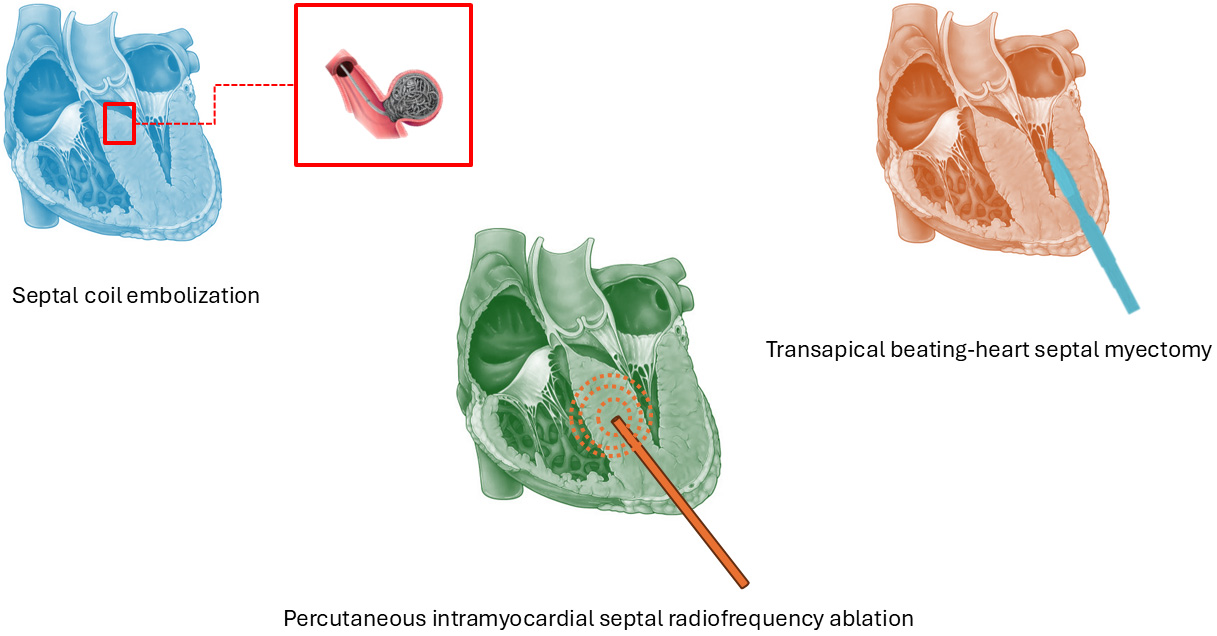 For decades, septal myectomy and alcohol septal ablation (ASA) have represented the two main options for STR. However, new strategies such as percutaneous intramyocardial septal radiofrequency ablation (PIMSRA), micro-coil septal embolization and transapical beating-heart septal myectomy (TA-BSM), have emerged as possible alternatives (Fig. 3). These techniques offer less invasive alternatives with promising efficacy. Compared to surgical myectomy, they present lower complication rates (5–10%), such as fewer conduction disturbances. They however tend to achieve a smaller reduction in LVOT gradient, especially in patients with complex anatomies [52]. Many of these new SRT techniques remain limited to specialized centres or are still in early-phase experience, with limited long-term data. Careful patient selection and individualized therapeutic planning remain essential. Moreover, MI and GT may promptly change LVOTO SRT indications.