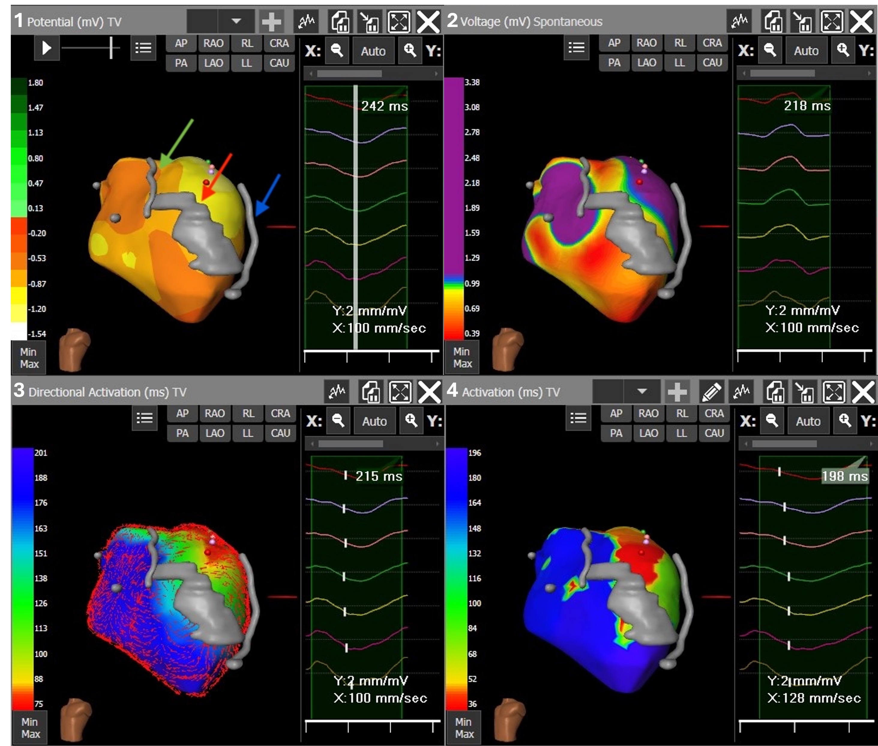 ECGi mapping performed with the CardioInsight system, LAO projection. Panels from left to right, up to down: (1) VT potential map providing a snapshot of unipolar activation. In gray the reconstruction of the LAD artery (indicated by the green arrow), a LV medio-apical calcification (indicated by the red arrow) and the LV epicardial catheter (indicated by the blue arrow). (2) Voltage map during atrial pacing showing a medio-apical and inferior scar; the scar is represented by voltages lower than 1 mV in red and non-purple colors, whereas normal voltages are displayed in purple. (3) VT directional activation map showing directional vectors of local activations. (4) VT activation map (first activation in red and latest in blue). The three maps combined suggest a reentry macrocircuit with a large epicardial exit area including the medio-basal antero-lateral LV wall. Legend: LAO, left anterior oblique; LAD, left anterior descending; LV, left ventricle; STAR, stereotactic arrhythmia radioablation; VT, ventricular tachycardia.