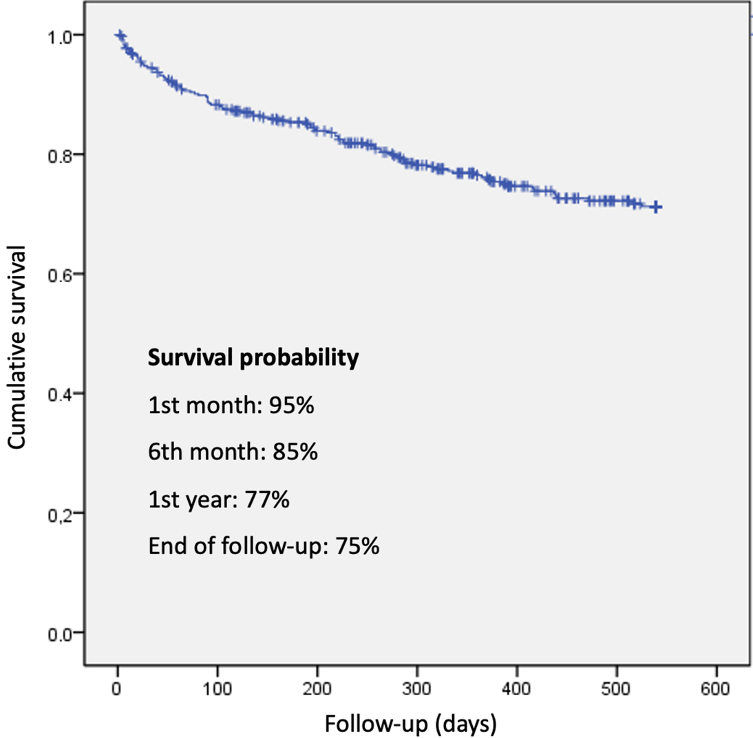 Survival was 94.5% at 30 days and 76.1% at one year, with an overall mortality