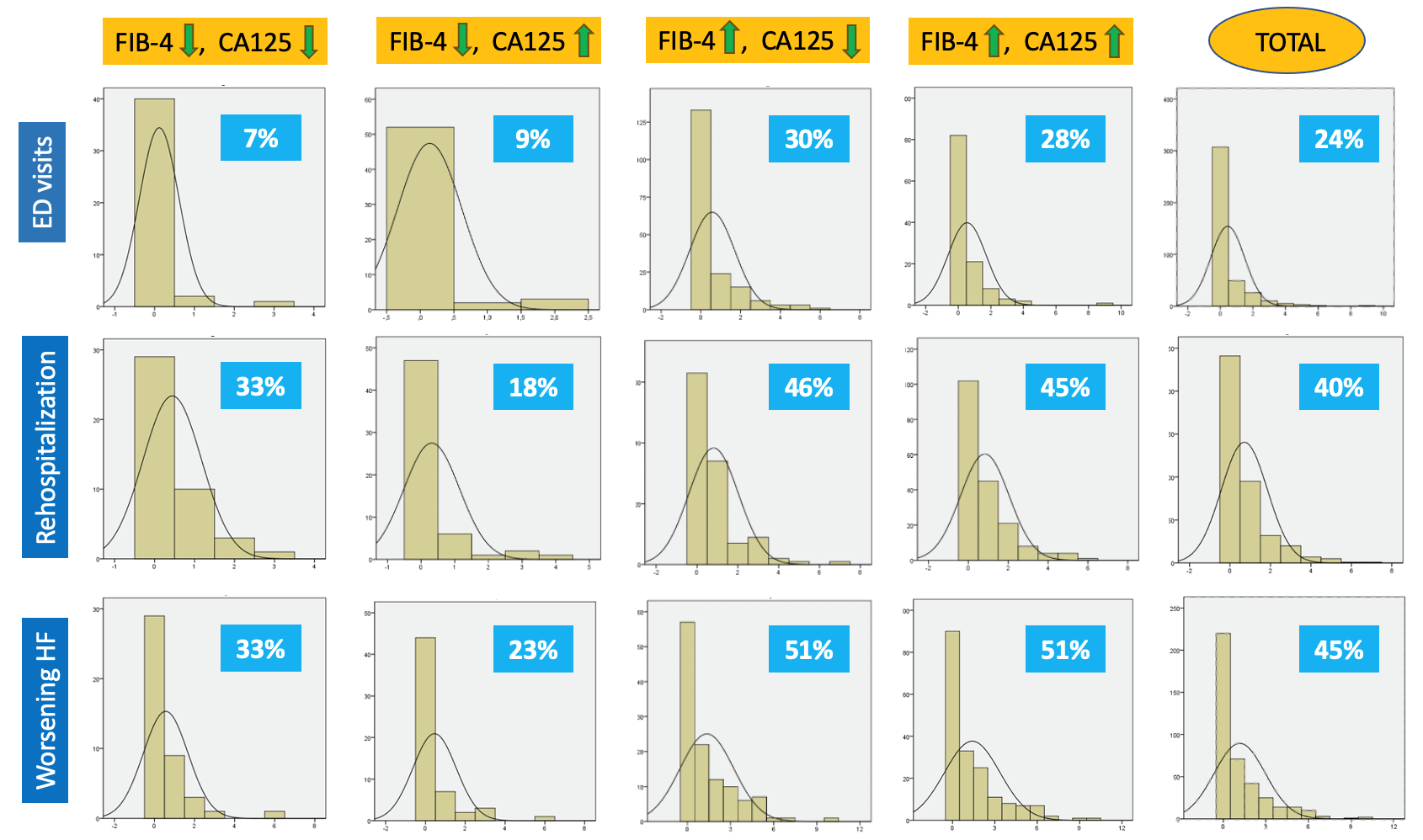 Percentage of patients with the event by group. Worsening HF is defined as the sum of emergency department visits requiring intravenous furosemide plus rehospitalization due to decompensated heart failure. Abbreviations: HF, Heart Failure; ED, Emergency Department; CA125, Carbohydrate Antigen 125.