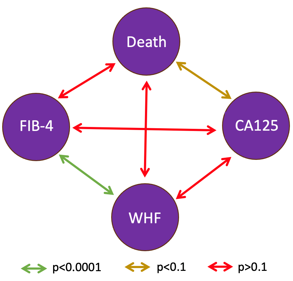 Correlation between biomarkers and morbidity-mortality variables. Abbreviations: CA125, Carbohydrate Antigen 125; WHF, Worsening Heart Failure.