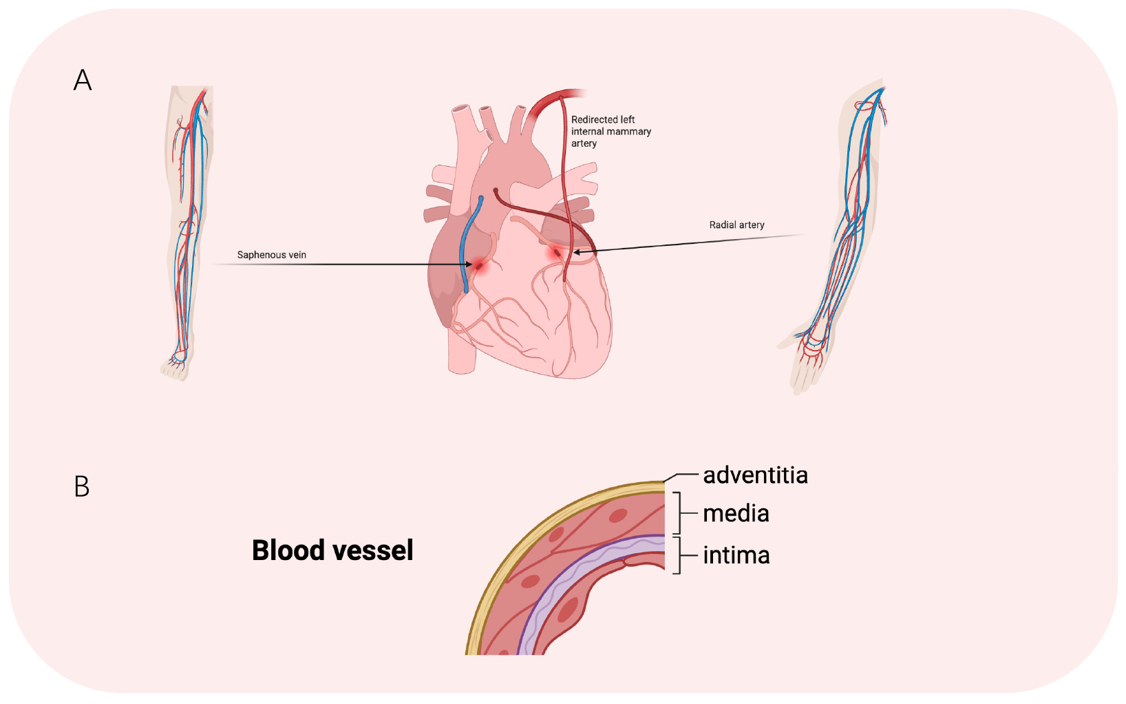 Schematic illustration of CABG and structural composition of a blood vessel. (A) Main options for autologous vascular substitutes. (B) Three-layer structure of blood vessels.