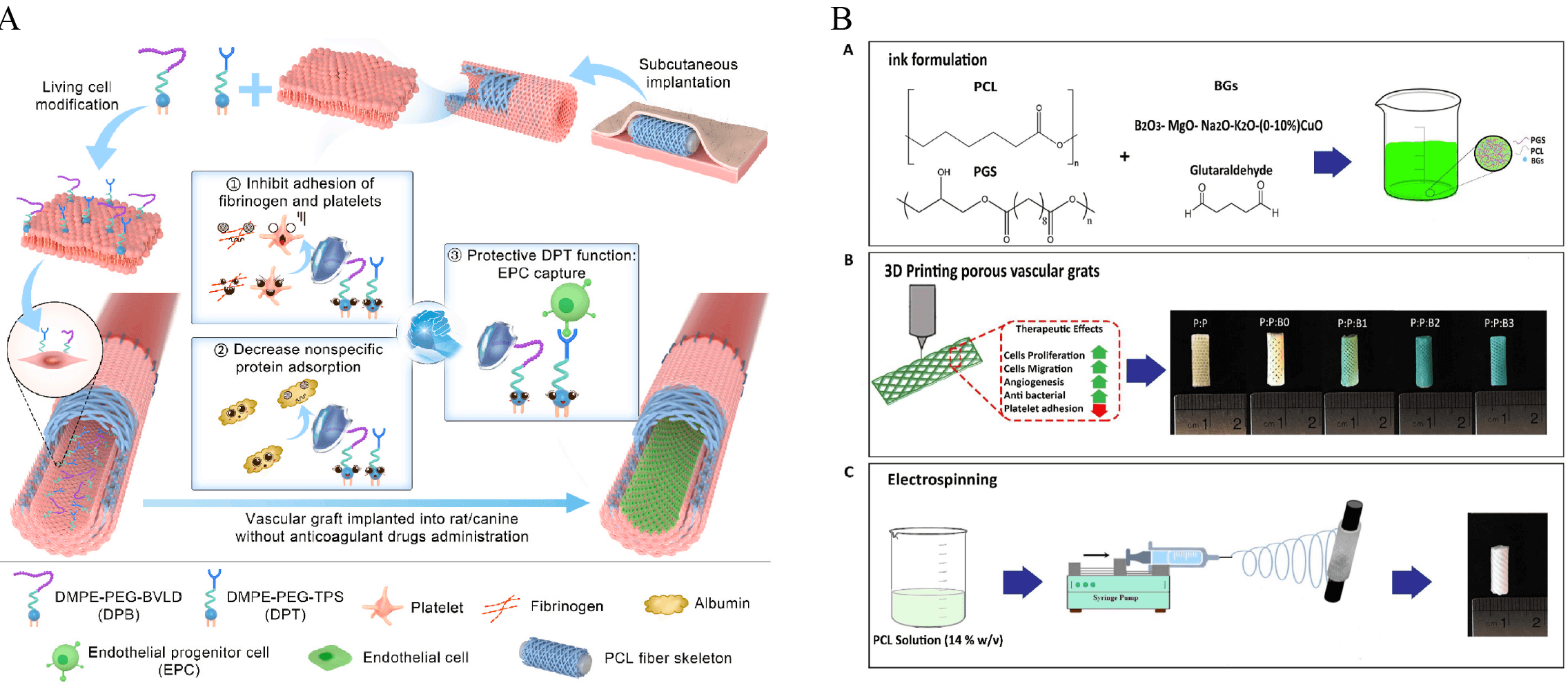Schematic representations of dual-modified PB vascular grafts and bilayer 3D-printed vascular scaffolds. (A) Combined modification of the luminal surface of in vivo engineered PB grafts with DPB and DPT significantly promoted in situ endothelialization without the need for anticoagulant therapy [135]. (B) Schematic illustration of the construction of a bilayer vascular graft. The inner layer consists of a 3D-printed porous structure composed of PGS, PCL, and modified bioactive glass (BG) to accelerate vascular remodeling [181]. EPC, endothelial progenitor cell; PB, poly(butylene)-based; DPB, 2,2′-dithiodipyridine–based biofunctional linker; DPT, dual-peptide treatment; PGS, poly(glycerol sebacate).