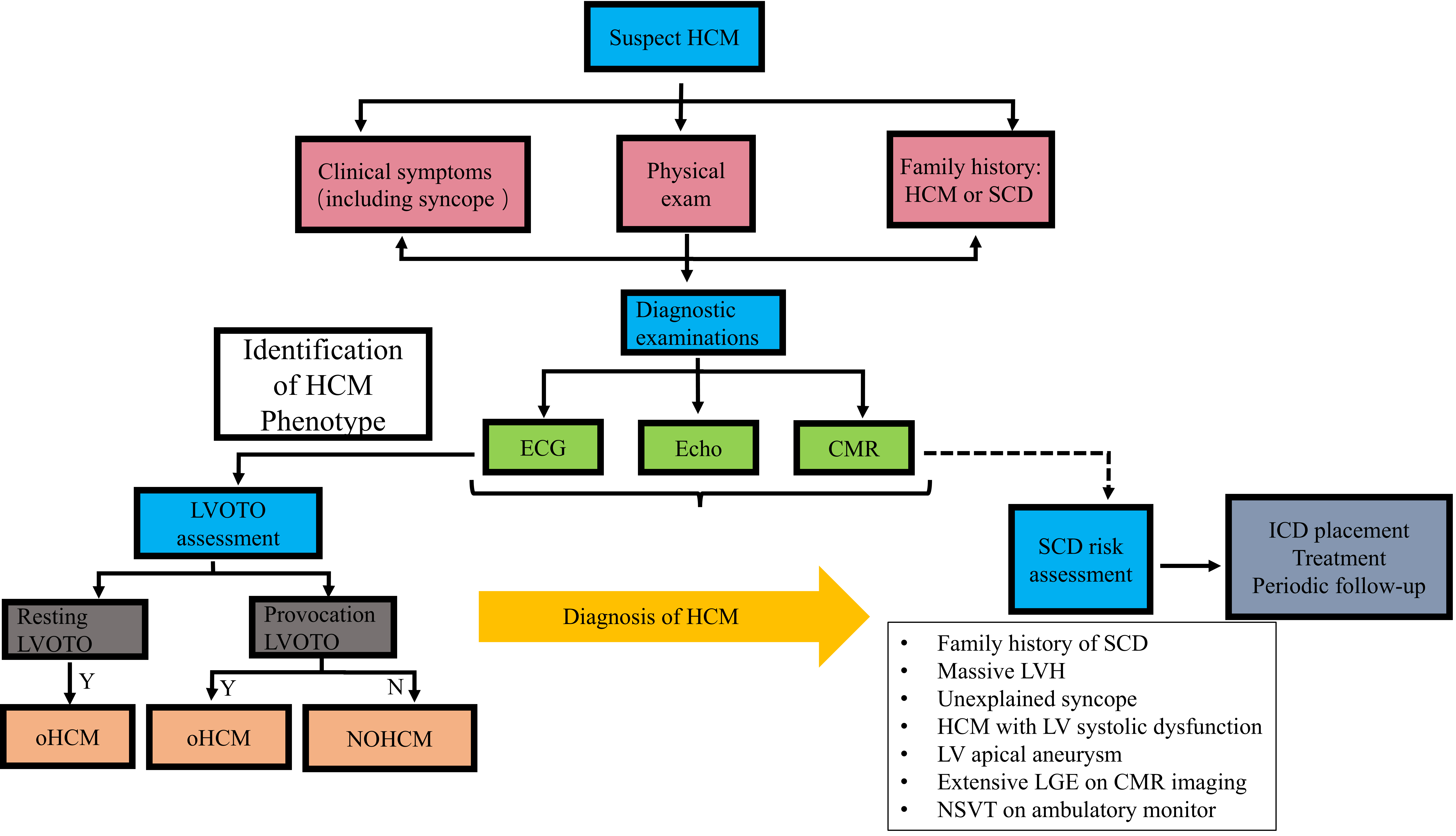 Fig. 1. The diagnosis flow chart of HCM. HCM, hypertrophic cardiomyopathy; SCD, sudden cardiac death; ECG, electrocardiograph; Echo, echocardiogram; CMR, cardiovascular magnetic resonance; LVOTO, left ventricular outflow tract obstruction; Y, yes; N, no; oHCM, obstructive hypertrophic cardiomyopathy; NOHCM, non-obstructive hypertrophic cardiomyopathy; ICD, implantable cardioverter-defibrillator; LVH, left ventricular hypertrophy; LV, left ventricular; NSVT, non-sustained ventricular tachycardia; LGE, late gadolinium enhancement.