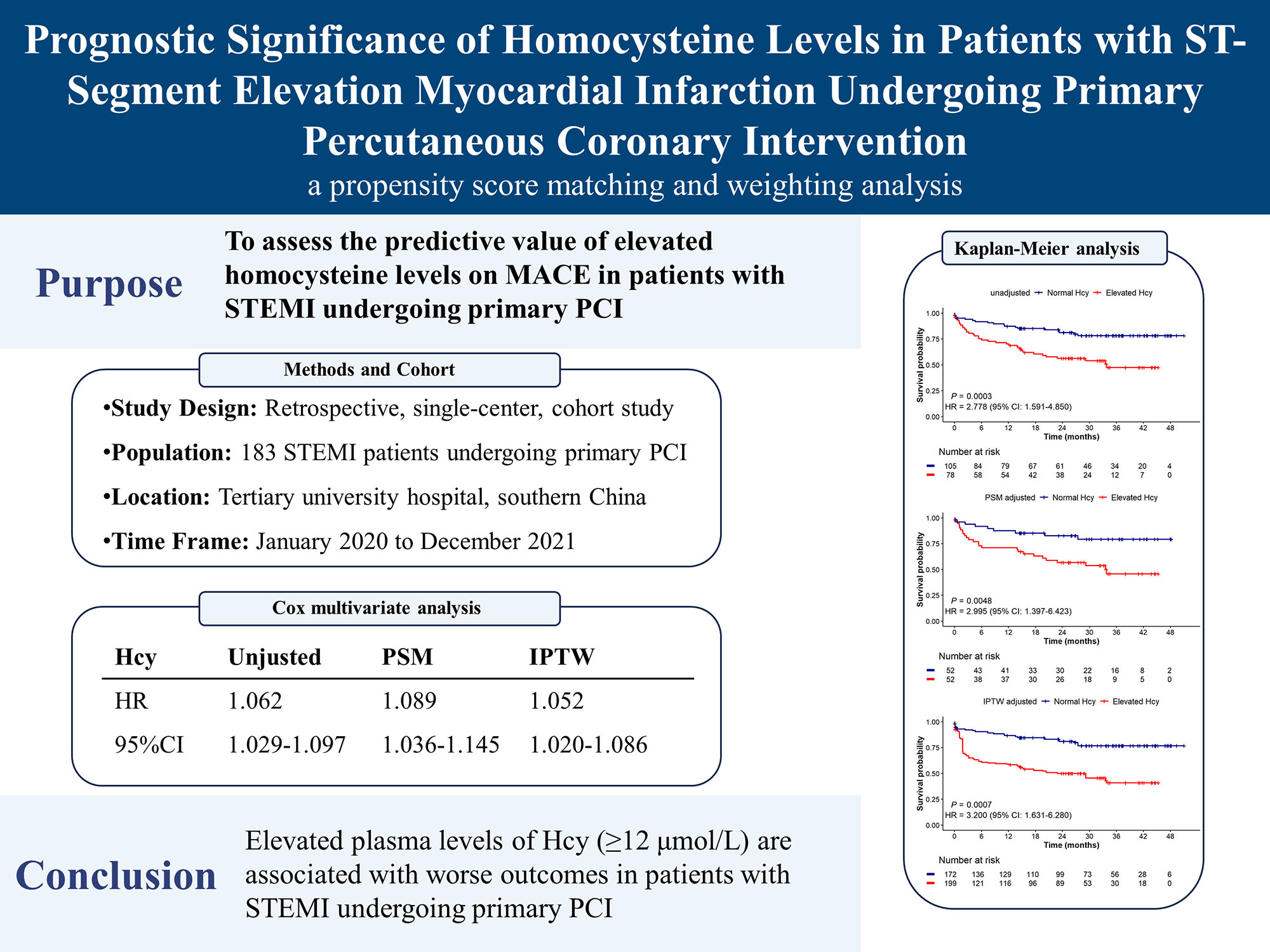 This retrospective cohort study included 183 STEMI patients who underwent primary PCI at a tertiary university hospital in southern China from January 2020 to December 2021. Laboratory values, including Hcy levels, were obtained within 24 hours of admission. Patients were categorized into elevated and normal Hcy groups using a threshold of 12 μmol/L. The study outcome was the occurrence of 6-point MACE, defined as cardiac death, nonfatal myocardial infarction, stroke, ischemia-driven revascularization (PCI or coronary artery bypass grafting), heart failure and all-cause death. Survival analyses were conducted using Kaplan-Meier and Cox proportional hazard methods. Propensity score matching (PSM) and inverse probability of treatment weighting (IPTW) approaches were employed to minimize bias.