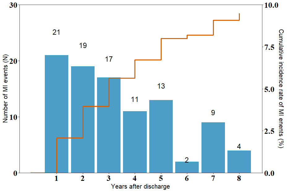 During a median follow-up period of 1.7 years (interquartile range: 1.0–3.0 years), 96 new cases of MI were identified. The crude rates of MI events over time were as follows: 1-year MI rate: 2.1%, 3-year rate: 5.8%, 5-year rate: 8.2%, and