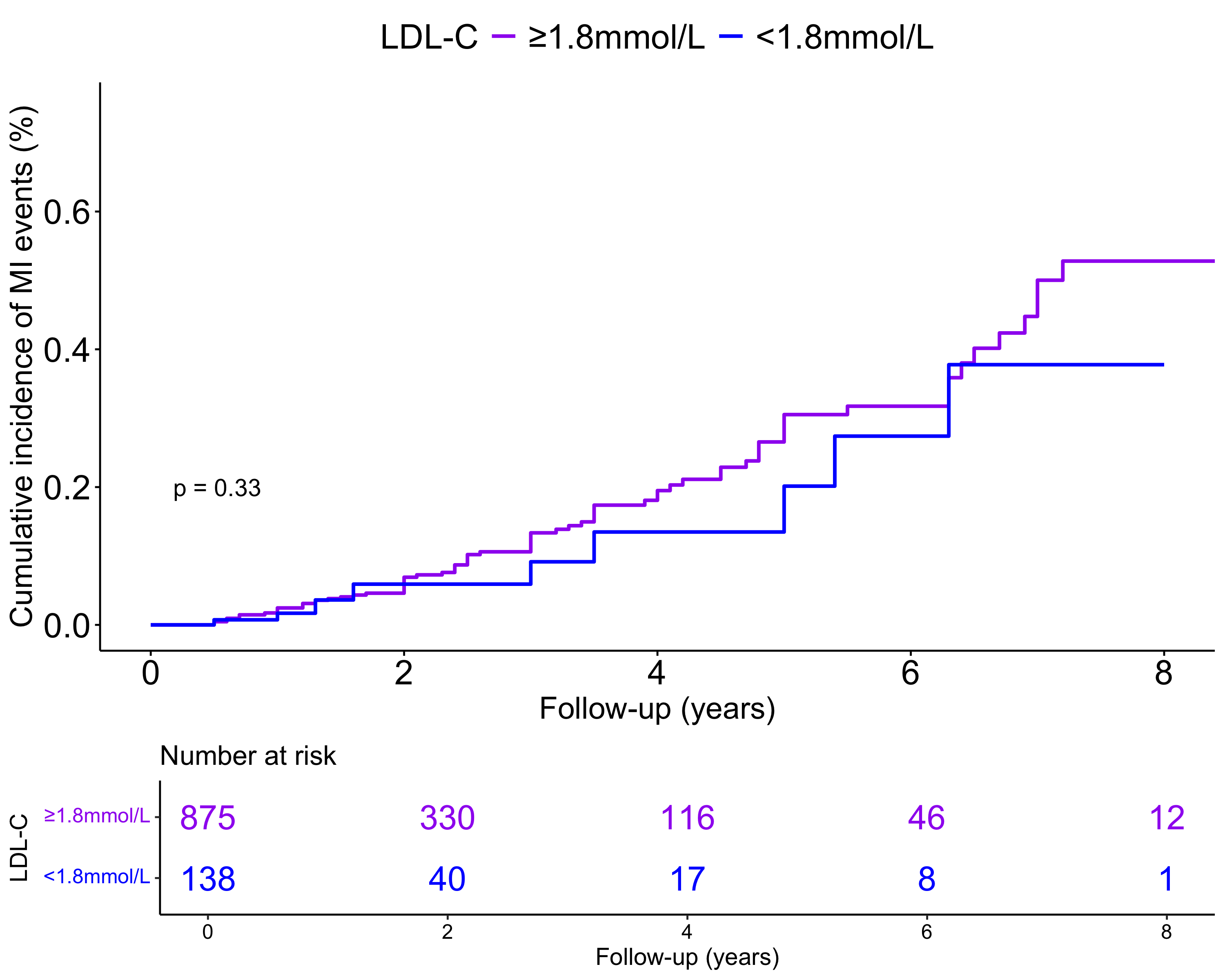 Kaplan-Meier survival analysis curves (Fig. 2) illustrated the cumulative incidence of MI events in two groups, based on a baseline LDL-C threshold of 1.8 mmol/L. The group with LDL-C levels