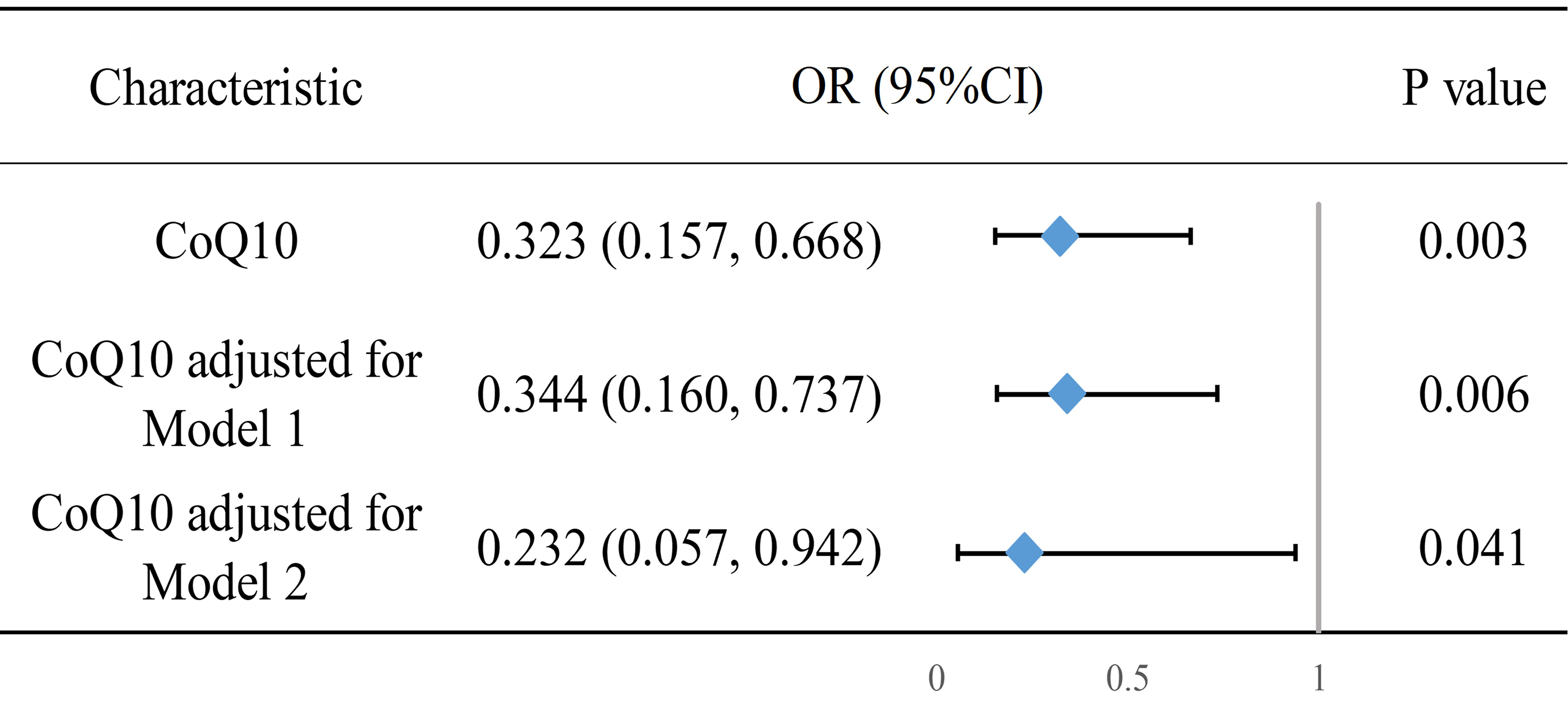 | CoQ10 | 0.323 | 0.157, 0.668 | 0.003 | |