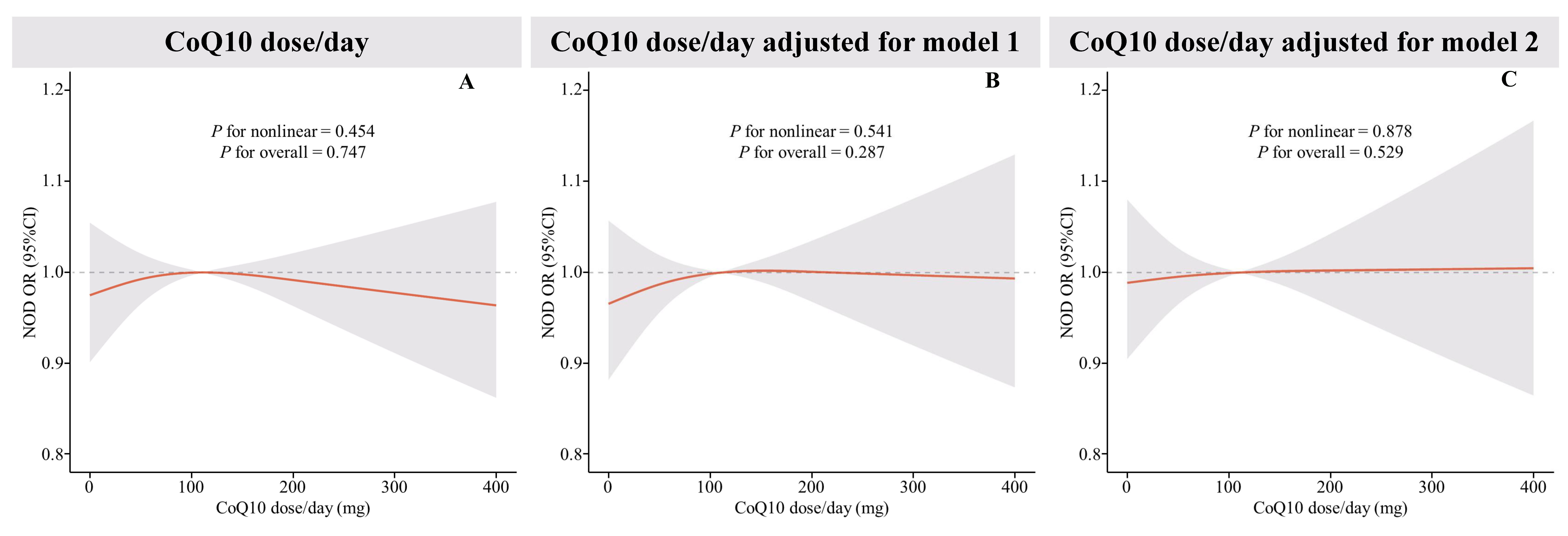 Restricted cubic spline (RCS) plot of the relationship between CoQ10 daily dose and new-onset diabetes. (A) RCS curves of the correlation between CoQ10 daily dose and new-onset diabetes were shown, (B) RCS curves of the correlation between CoQ10 daily dose and new-onset diabetes under Model 1 adjustment, and (C) RCS curves of the correlation between CoQ10 daily dose and new-onset diabetes under Model 2 adjustment. The red lines represent odds ratios and shading indicates 95% confidence intervals. New onset diabetes was derived via logistics regression using RCS, with adjustments made in model 1 and model 2. Model 1 accounts for age, sex, race, PIR, and educational attainment. Model 2 further adjusts for hypertension, CVD, heart failure, waist circumference, LDL-C, and the age at which statin therapy was initiated.