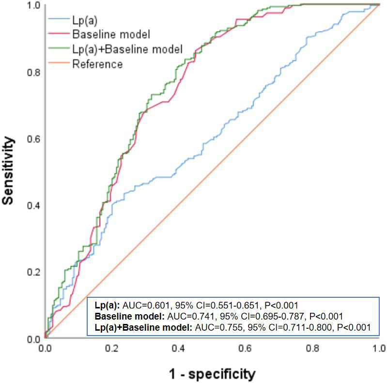 Fig. 1 showed the ROC curve analysis results of Lp(a) in predicting CAC. The baseline model consisted of all variables from Table 3 (age, sex, smoking, hypertension, CKD, antihypertensive drugs, SBP, and eGFR). The results indicated that the AUC for predicting CAC using Lp(a) alone was 0.601 (95% CI: 0.551–0.651, p