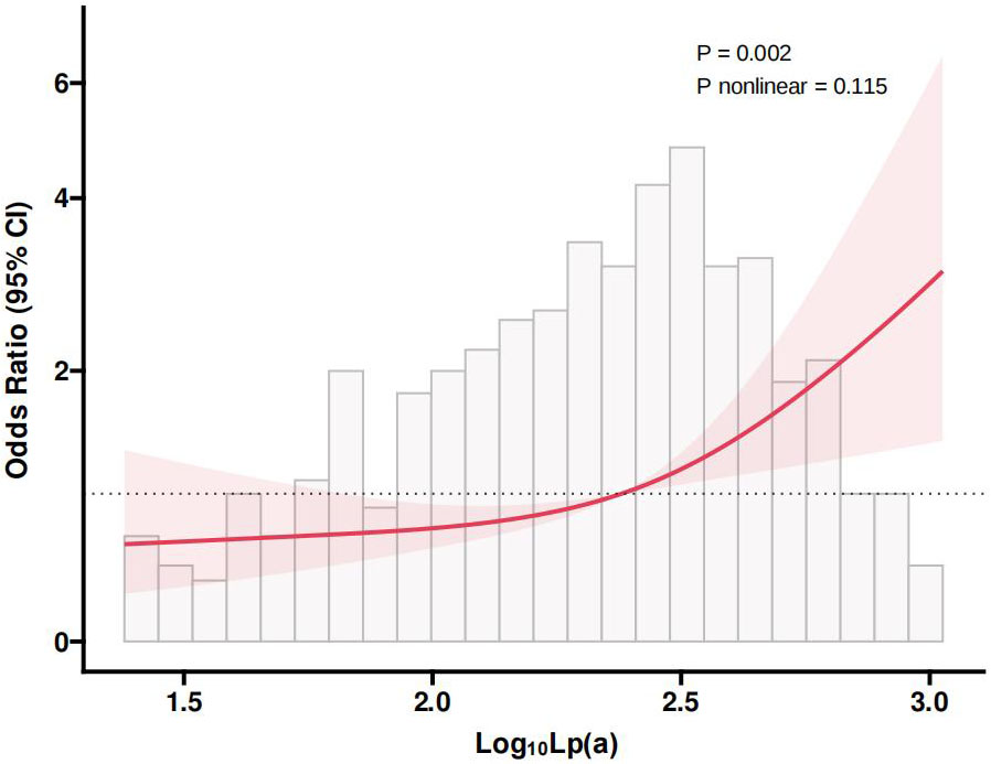 Fig. 2. RCS plot of the nonlinear association between Lp(a) and CAC. Lp(a), lipoprotein(a); CAC, coronary artery calcification; RCS, restricted cubic spline; CI, confidence interval.