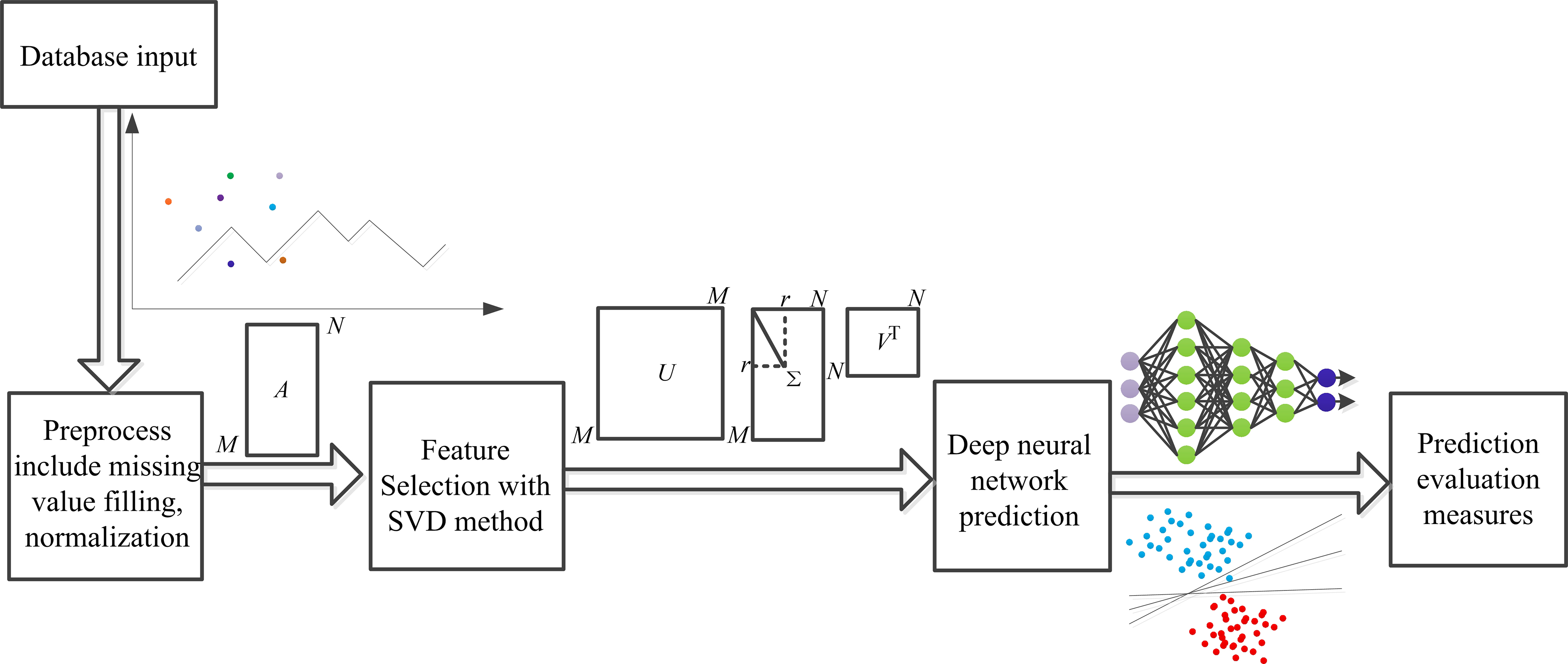 Singular value decomposition-based feature selection method: After data preprocessing for missing data filling with average values, features were selected with the SVD method. SVD is an algorithm widely used in machine learning, which has important applications in dimensionality reduction and feature extraction. The basic principle is to decompose a complex matrix into three matrixes: the left singular vector matrix, the singular value matrix, and the right singular vector matrix. The product of these three matrices is equal to that of the original matrix under certain conditions, which provides great convenience for analyzing and processing data.