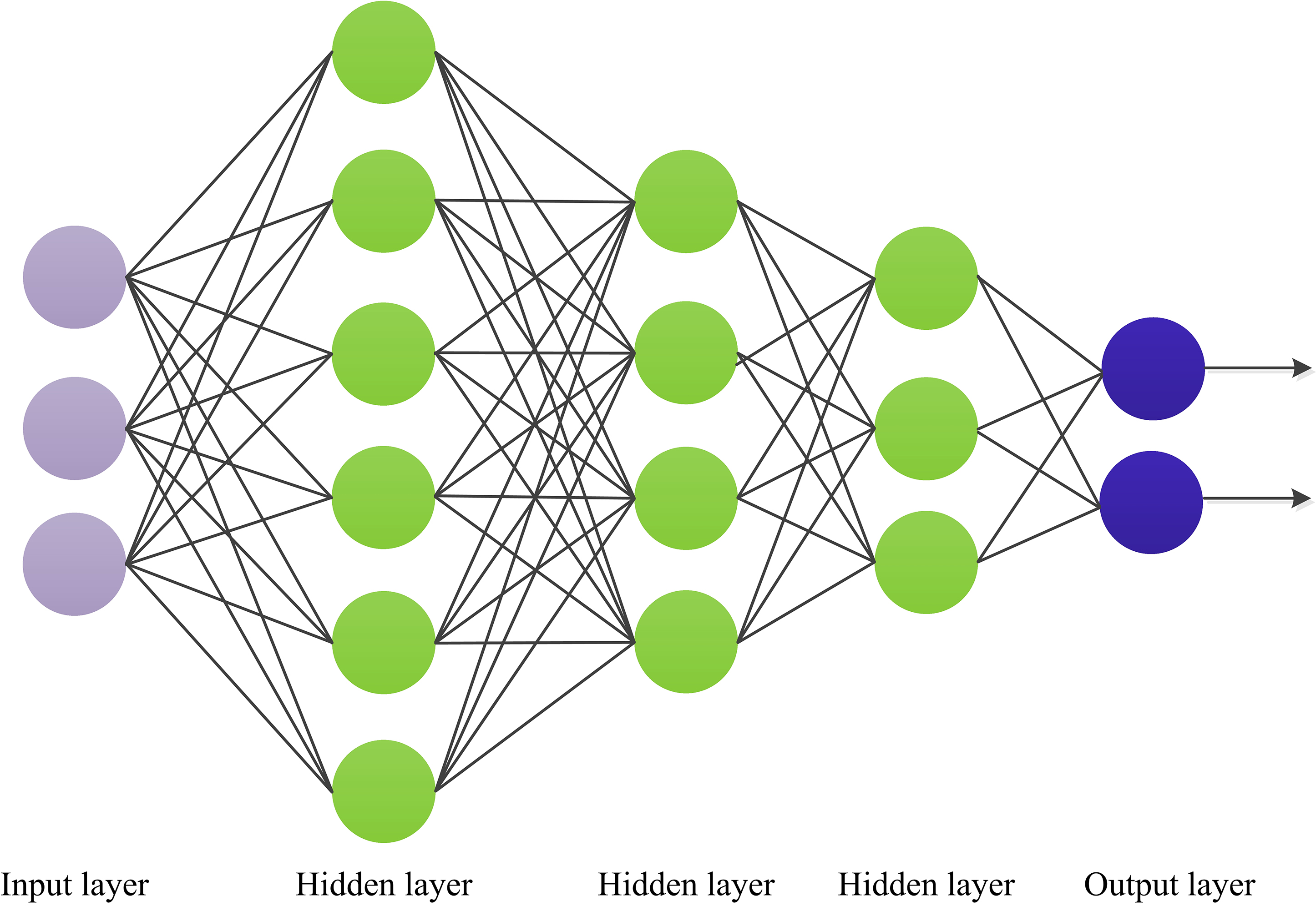 MLP, an artificial neural network with one input layer, multiple hidden layers, and one output layer, as shown in Fig. 2. The MLP has numerous layers of nodes, each fully connected to the next. In addition to the input nodes, each node is a neuron with a nonlinear activation function. A backpropagation algorithm is used to train MLPs. The MLP method can implement nonlinear discriminant and learn any nonlinear input function. A previous studyfound a nonlinear relationship between clinical factors, such as age, weight, sex, etc., and CHD [22]. The MLP is a universal estimator, which can used to estimate nonlinear functions. Therefore, we used the MLP method in this study to establish the CHD prediction model. The number of features selected determines the number of neurons in the input layer; it was set to 10 in this study. The number of hidden layers was set as 5.