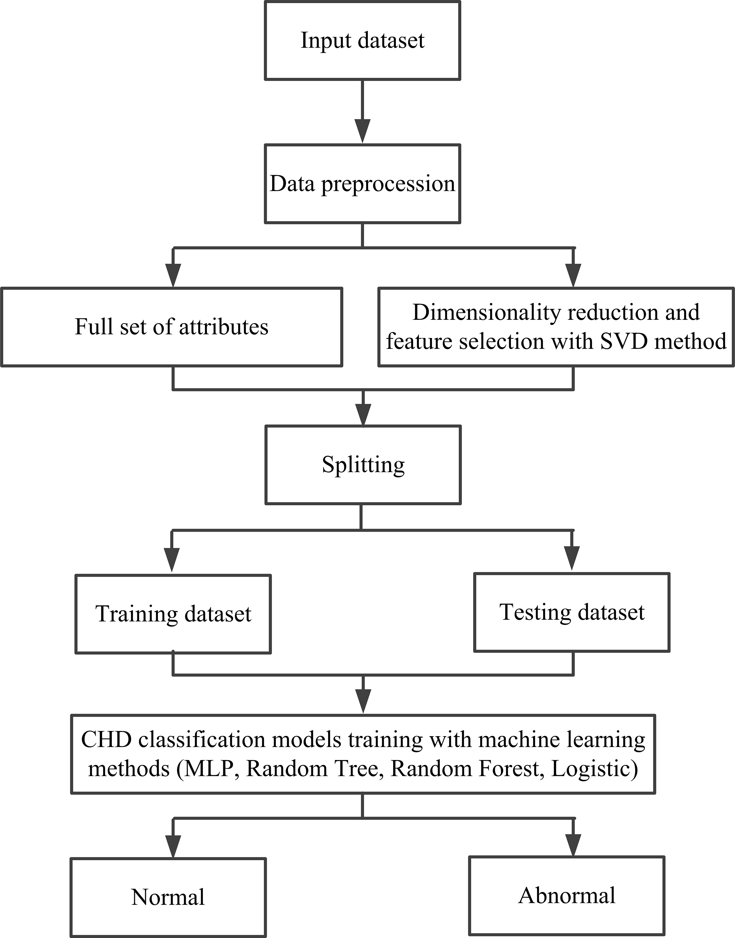 Specifically, the SVD method was used for feature extraction after data preprocessing. Then, a CHD prediction model was established with a 5-fold cross-validation method using a MLP classifier. In addition, the other four CHD prediction models were also established with random tree, random forest, logistic, and MLP only. Finally, performance indices, including accuracy, precision, recall, F1-score, and AUC, were computed and compared for each model established in this study on five public and one mixed dataset, respectively. Results show that each performance index of this proposed model achieved the best compared to other models on each dataset tested in this study.