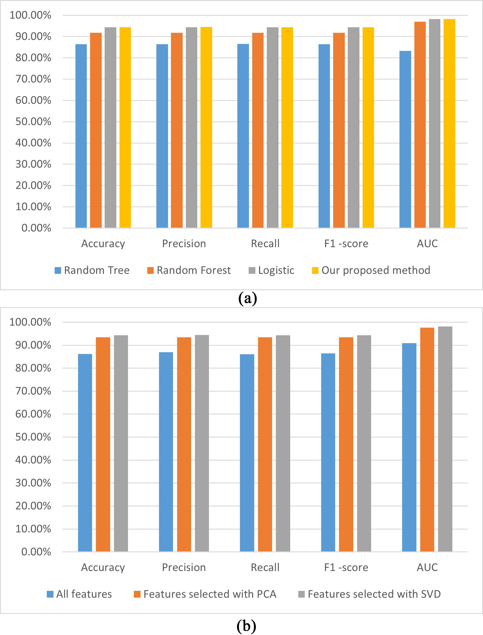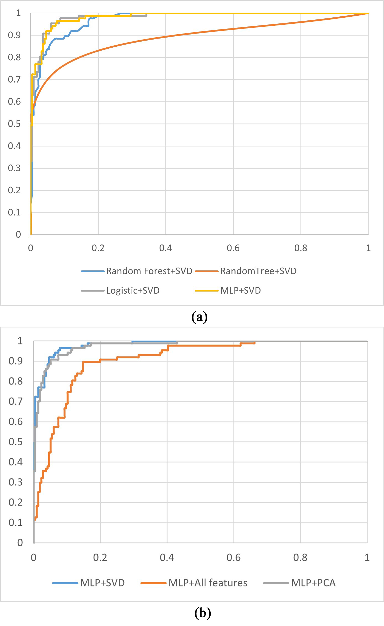 The visualization performances of the different models established in this study are shown in Fig. 4, whereby Fig. 4a shows the performance of models established with SVD-based features using random tree, random forest, and logistic, respectively. Fig. 4b shows the performances of the models built using the MLP method with all PCA- and SVD-based features, respectively.