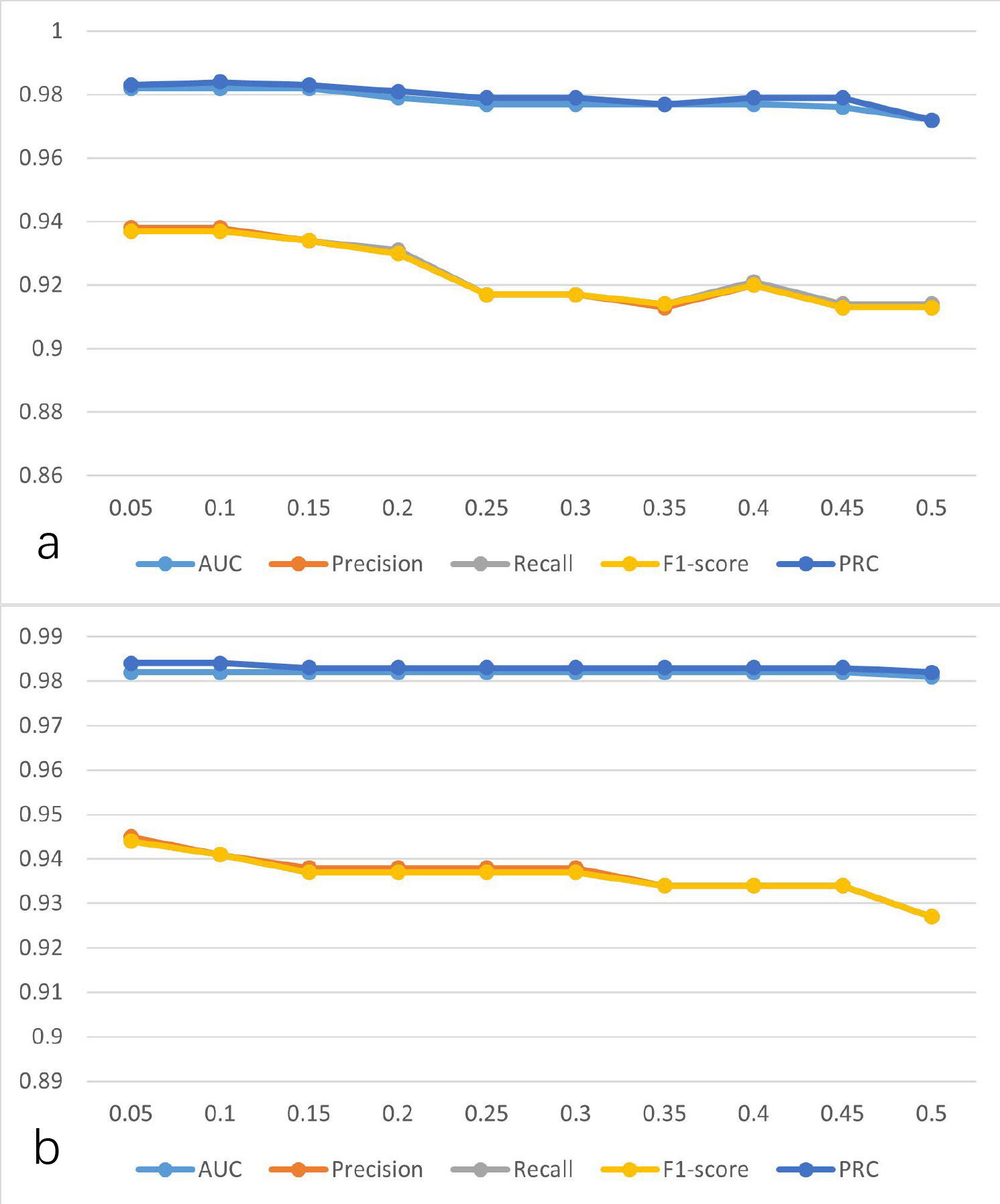 To explore the influence of hyperparameters on the performance of the model, the learning rate was gradually increased from 0.05 to 0.5 at intervals of 0.05, and the changes in model performance indicators are shown in Fig. 6a. As illustrated in Fig. 6a when the learning rate is set to 0.1, the performance of the model is better than others. Similarly, the performance indicators are shown in Fig. 6b for when the momentum is gradually increased from 0.05 to 0.5 at intervals of 0.05. As can be seen from Fig. 6b, when the momentum is set to 0.05, the performance of the model is better than others. Thus, the learning rate and the momentum were set to 0.1 and 0.05, respectively.