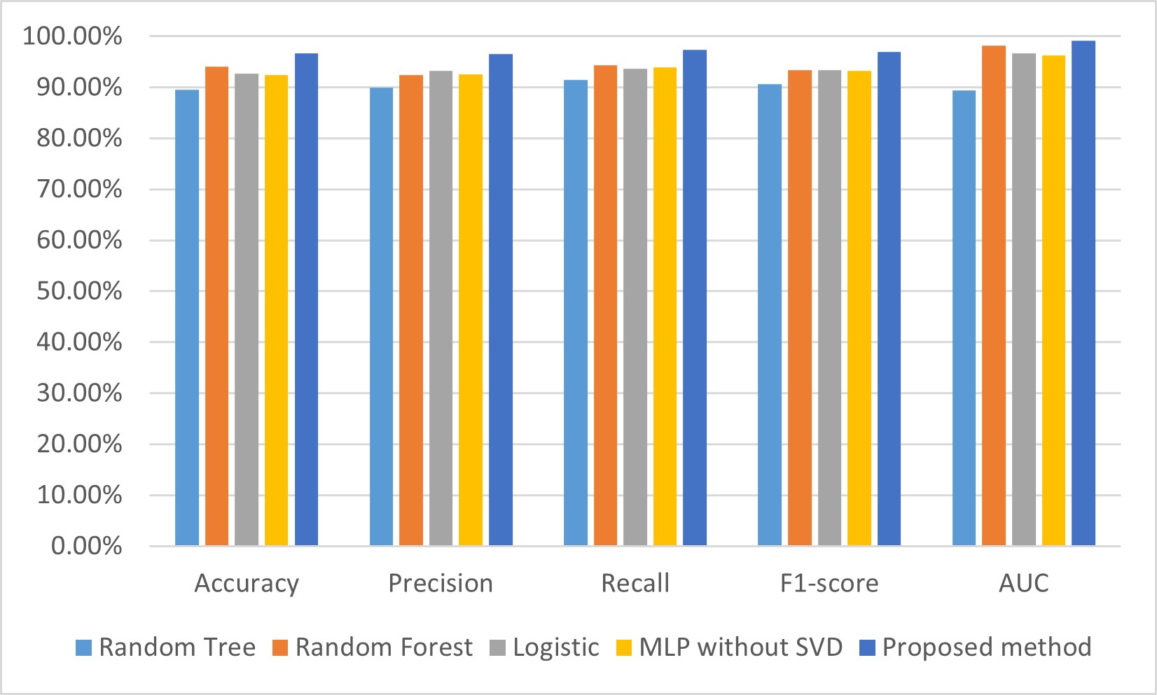 From Table 6, we can see that the accuracy, precision, recall, F1-score, and AUC of our proposed model was 96.63%, 96.5%, 97.4%, 97%, and 99.1%, respectively, which are all higher than the models established using random tree, random forest, logistic, and the MLP without SVD. Specifically, the accuracy, precision, recall, F1-score, and AUC of our proposed model are higher by 2.61%–7.06%, 3.3%–6.6%, 3%–6%, 3.6%–6.4%%, and 0.9%–9.7%, respectively, than the other four CHD prediction models established in this study.