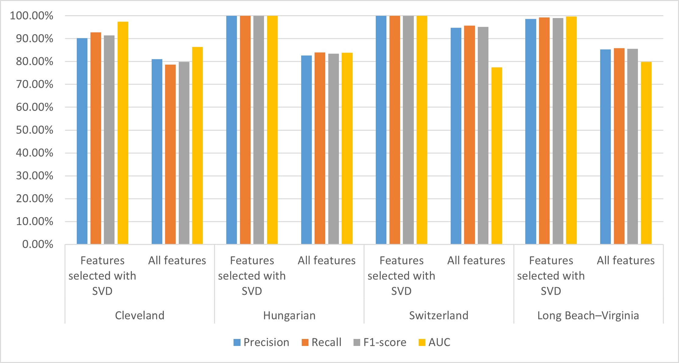 From Table 8, we can see that the performance of the CHD detection model established using SVD-based selected features is better on each of the four datasets than the model built using all features. Specifically, the AUC values of our proposed model achieved 97.50%, 100.00%, 100.00%, and 99.70% on the Cleveland, Hungarian, Switzerland, and Long Beach–Virginia datasets, respectively, which is 11.1%, 16.2%, 22.5%, and 19.8% higher, respectively, than the model built using all features. The precision, recall, and F1-score values of our proposed model on the four datasets are 5.2%–17.3%, 4.3%–16%, and 4.8%–16.6% higher, respectively, than the model built using all features.