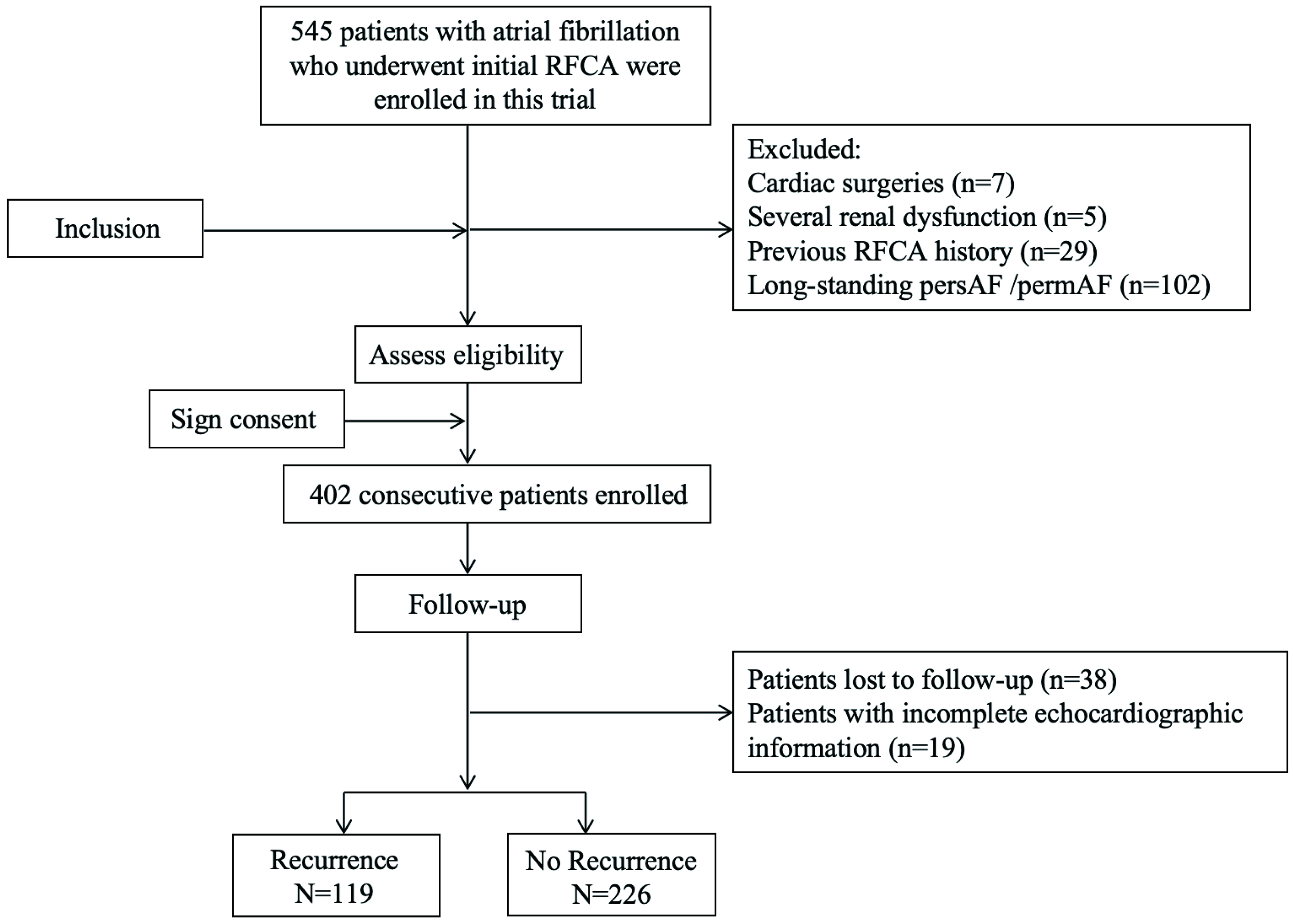 This single-center, prospective, observational cohort study included a total of 545 consecutive patients with AF who underwent RFCA at Beijing Anzhen Hospital between January and December 2019. Inclusion criteria were: (1) age