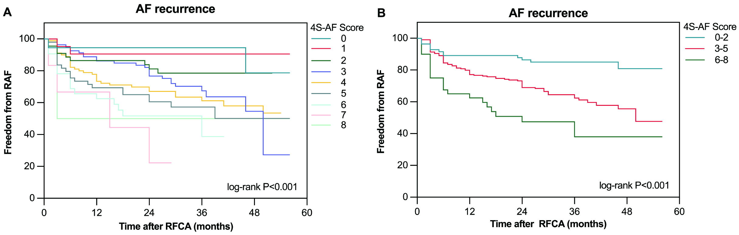 Fig. 2. The Kaplan–Meier curve demonstrated the difference in AF recurrence after RFCA between different 4S-AF scores. (A) The Kaplan–Meier curve for AF recurrence after RFCA, based on 4S-AF scheme scores, is divided into nine groups (0–8 points). (B) The Kaplan–Meier curve for AF recurrence after RFCA based on 4S-AF scheme scores is divided into three categories (0–2 points, 3–5 points, 6–8 points). RAF, recurrence of atrial fibrillation.