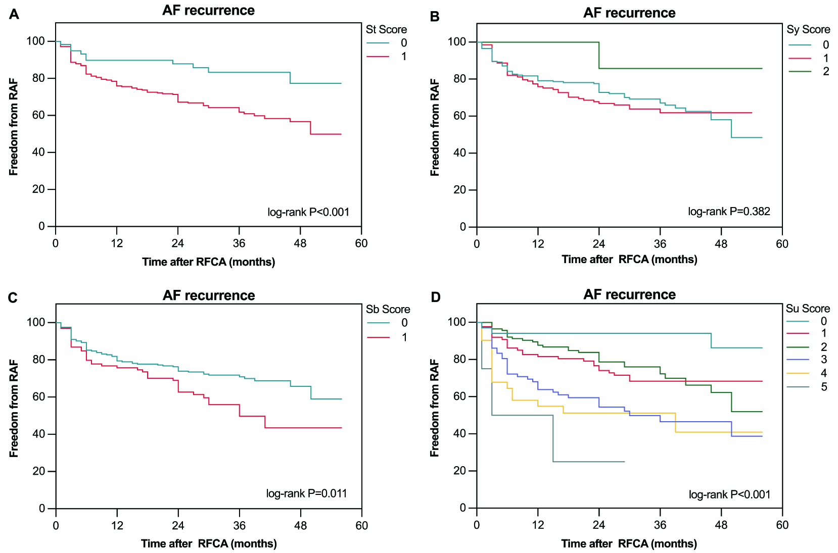 Fig. 3. The Kaplan–Meier curve demonstrated the difference in AF recurrence after RFCA between different scores for each domain: St domain (A), Sy domain (B), Sb domain (C), and Su domain (D).