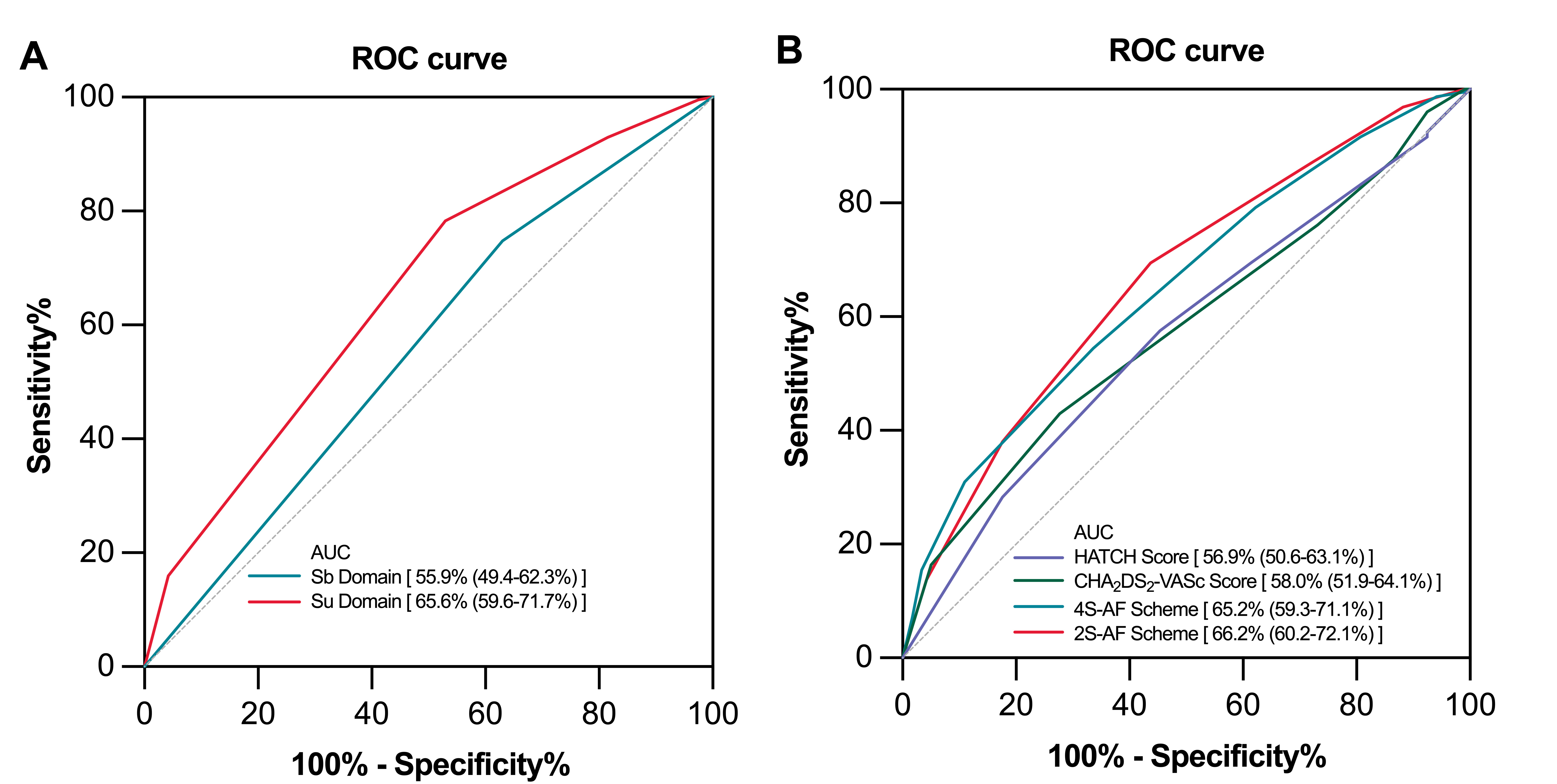 Fig. 4. Receiver operating characteristic (ROC) curves for predicting atrial fibrillation recurrence. Receiver operating characteristic (ROC) curves for the Sb and Su domains (A); ROC curves for the 4S-AF scheme, 2S-AF scheme, CHA2DS2–VASc score, and HATCH score (B). AUC, area under the curve; HATCH, Hypertension-Age