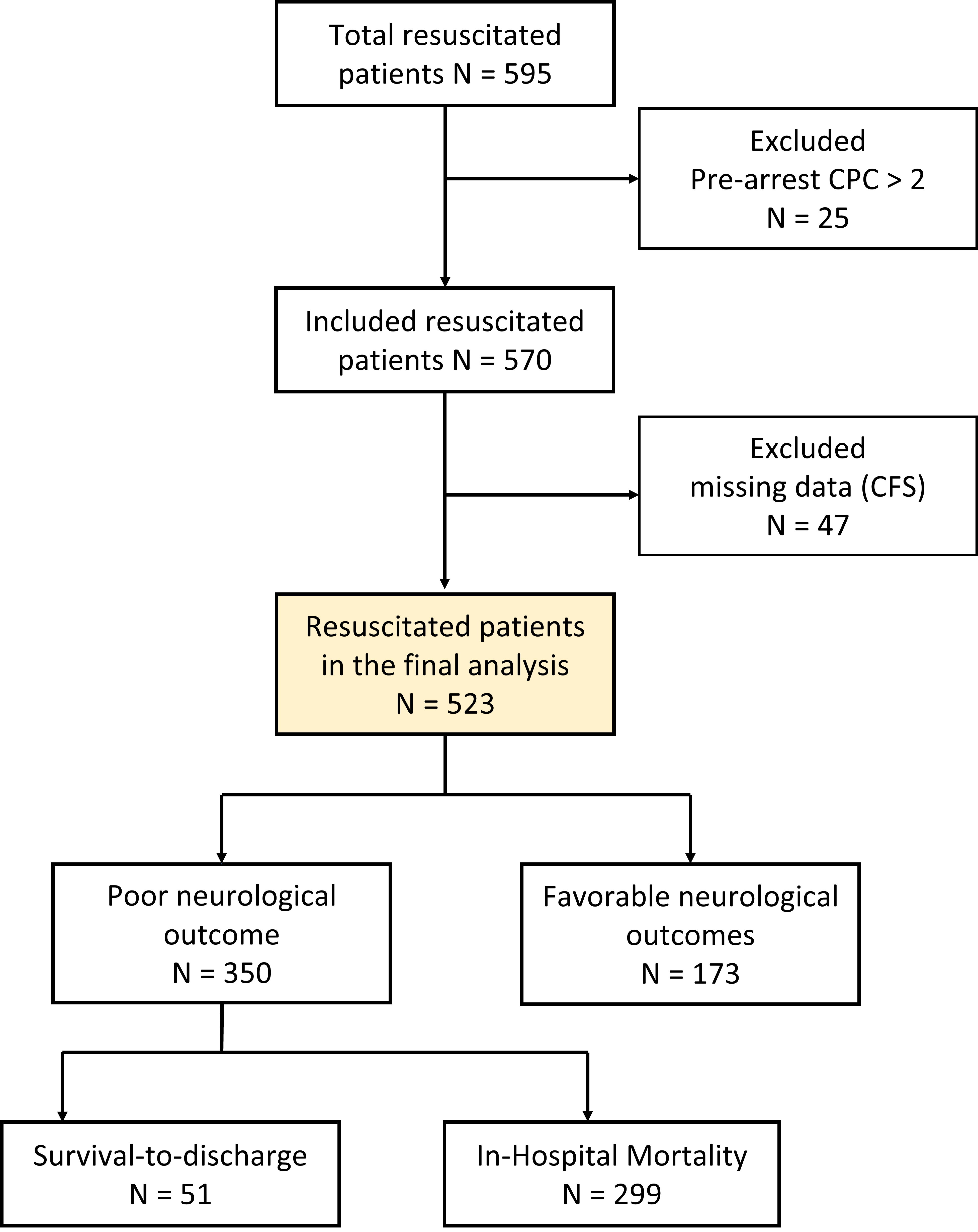 A total of 595 patients were analyzed. After excluding patients with pre-arrest CPC values greater than two or missing CFS data, 523 patients (224 survivors and 299 non-survivors) were included in the analysis. Among these, favorable neurological outcomes were demonstrated in 173 survivors (Fig. 1).
