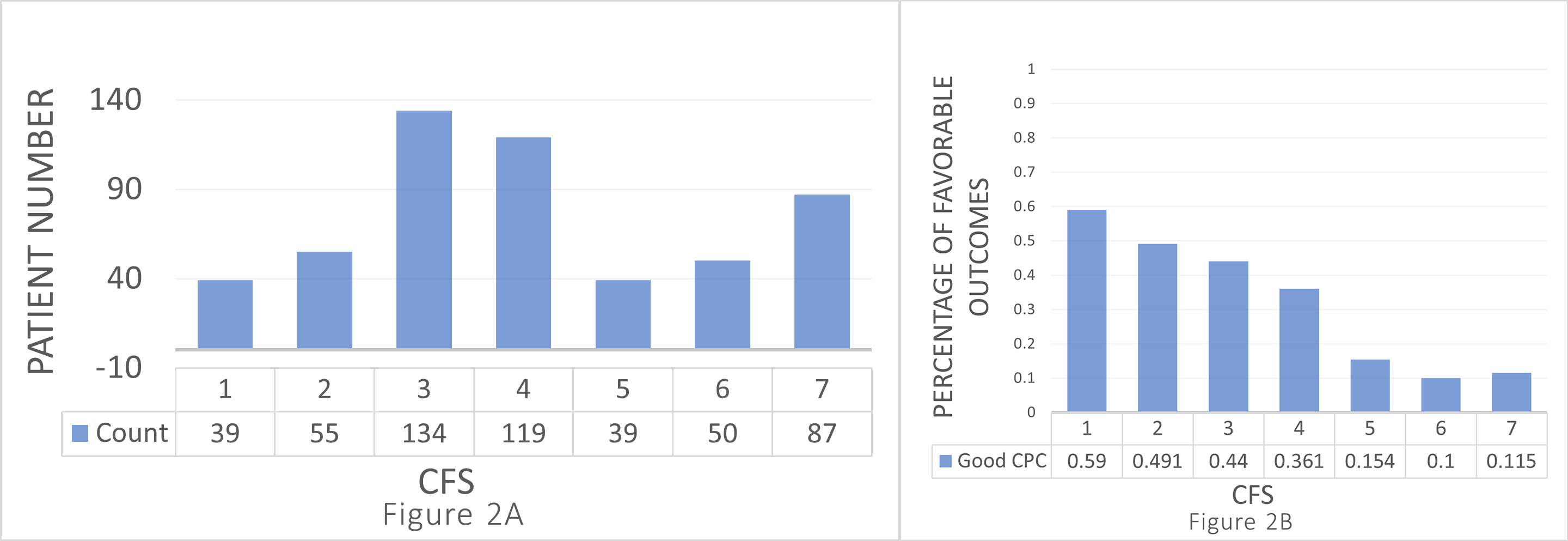Fig. 2. Distribution and outcomes by Clinical Frailty Scale (CFS) scores. (A) Number of patients for each CFS score. The distribution of individuals across different CFS categories ranges from 1 to 7. The distribution is as follows: CFS 1 (very fit), n = 39; CFS 2 (well), n = 55; CFS 3 (managing well), n = 134; CFS 4 (vulnerable), n = 119; CFS 5 (mildly frail), n = 39; CFS 6 (moderately frail), n = 50; CFS 7 (severely frail), n = 87. (B) Percentage of patients with good cerebral performance categories (CPC) for each CFS score. The percentage for good CPC (