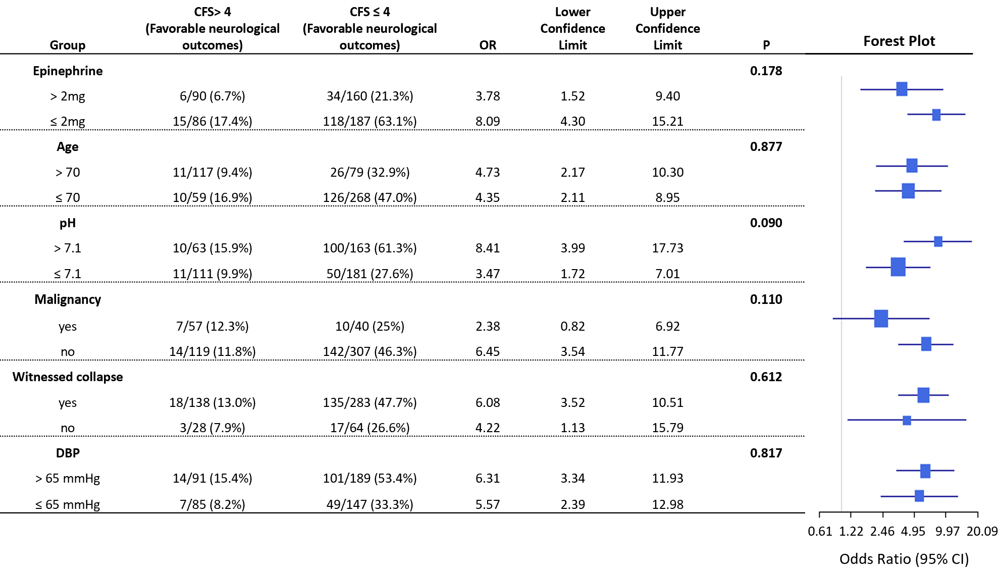 A forest plot (Fig. 4) examined potential interactions between the CFS and significant variables identified in the MLR model. This analysis assessed whether the relationship between lower CFS scores and improved neurological outcomes was influenced by factors such as epinephrine dosage during CPR (