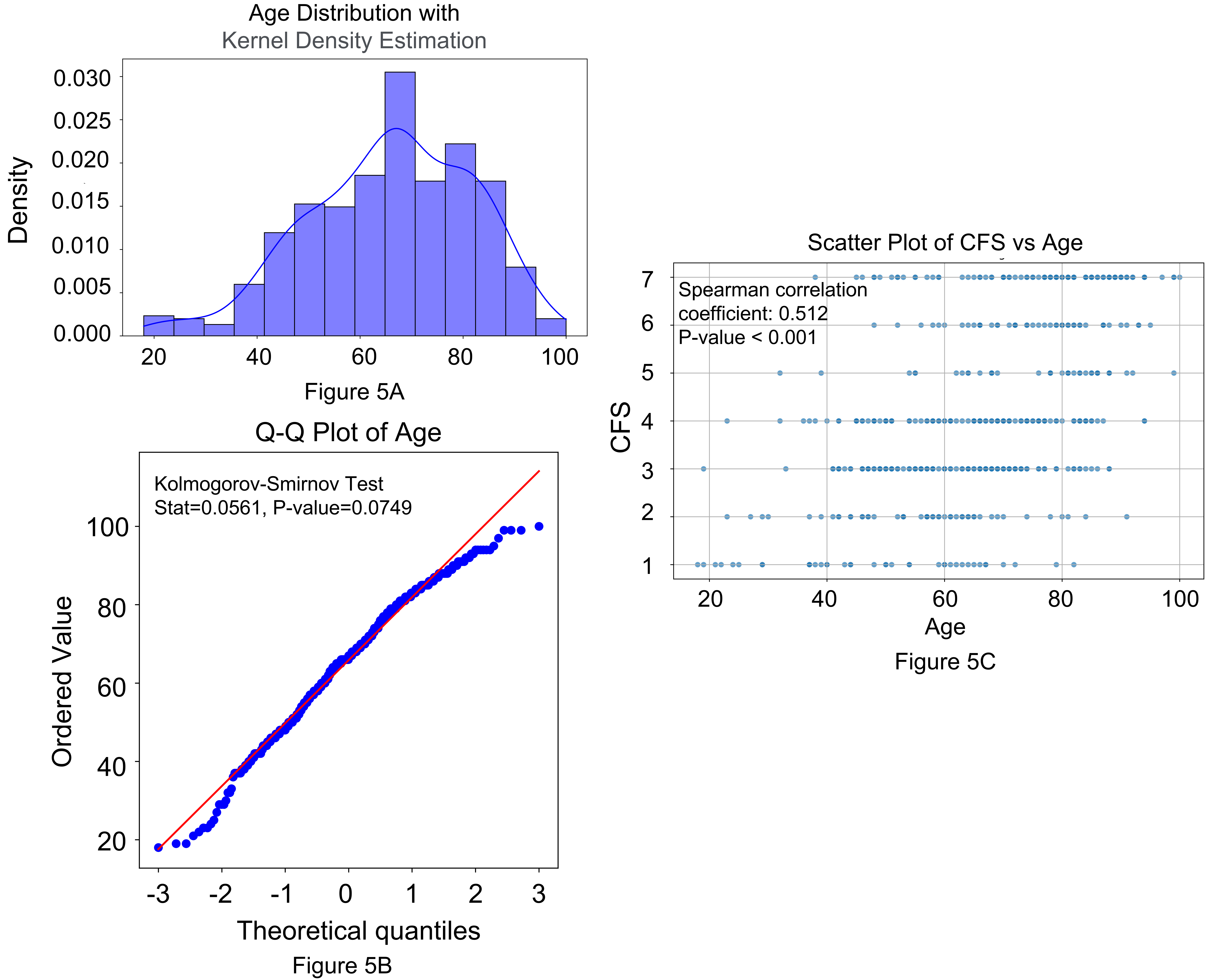 Fig. 5 illustrates the distribution of age and its relationship with CFS. The histogram (Fig. 5A) shows age distribution with a kernel density estimation (KDE) curve. The Q–Q plot (Fig. 5B) compares age quantiles to a theoretical normal distribution, with the Kolmogorov–Smirnov test suggesting approximate normality (p = 0.0749). A scatter plot (Fig. 5C) reveals a moderate positive correlation between age and CFS (Spearman’s coefficient = 0.512, p